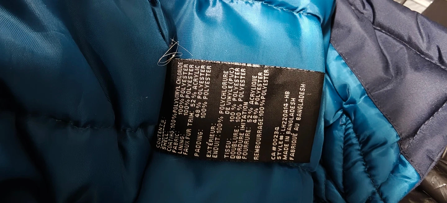 F.O.G. navy blue winter parka with a faux fur trimmed hood. It's lined with 100% polyester shell. This coat is fleece-lined with 52% acrylique and 48% polyester on the inside. Great for staying warm on cold days!