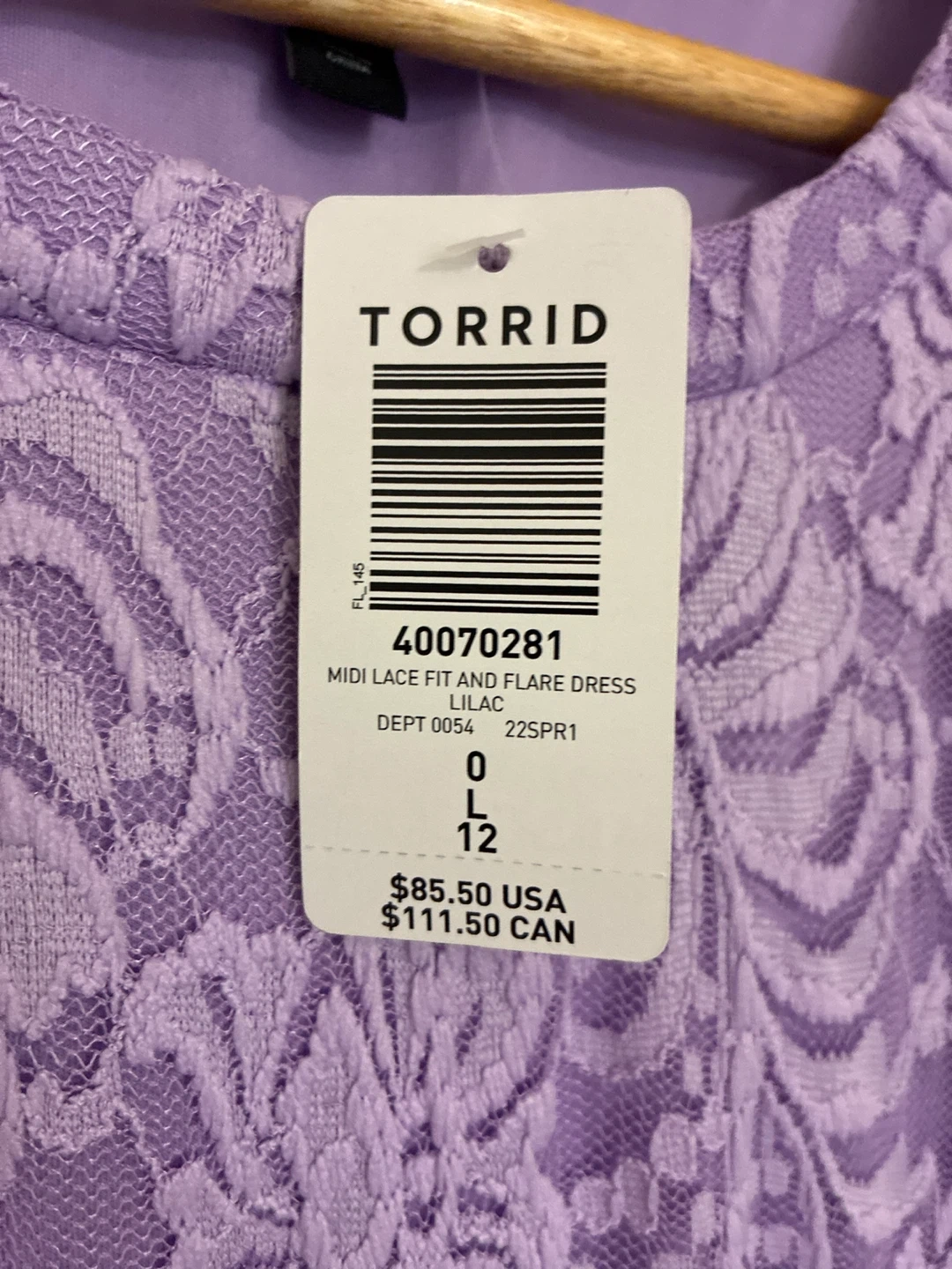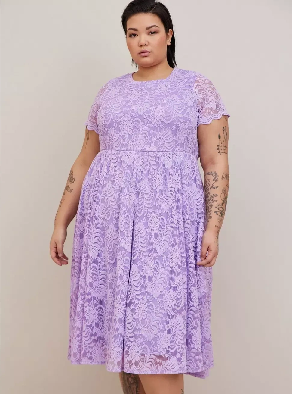 This is a Torrid fit and flare midi dress in a beautiful lavender colour. The dress is made of lace and is perfect for a special occasion or a night out. It's a stylish and comfortable dress that will make you feel confident and beautiful!
