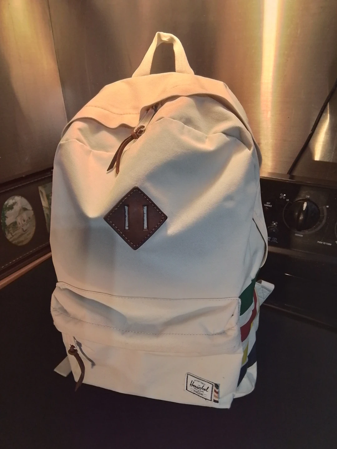 This is a vintage Herschel backpack, a collaboration with Hudson's Bay, measuring 18x16 inches, perfect for style and function. Being a gently owned item, it brings a touch of heritage and durability to your everyday carry.