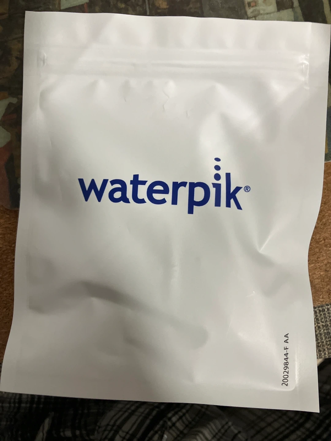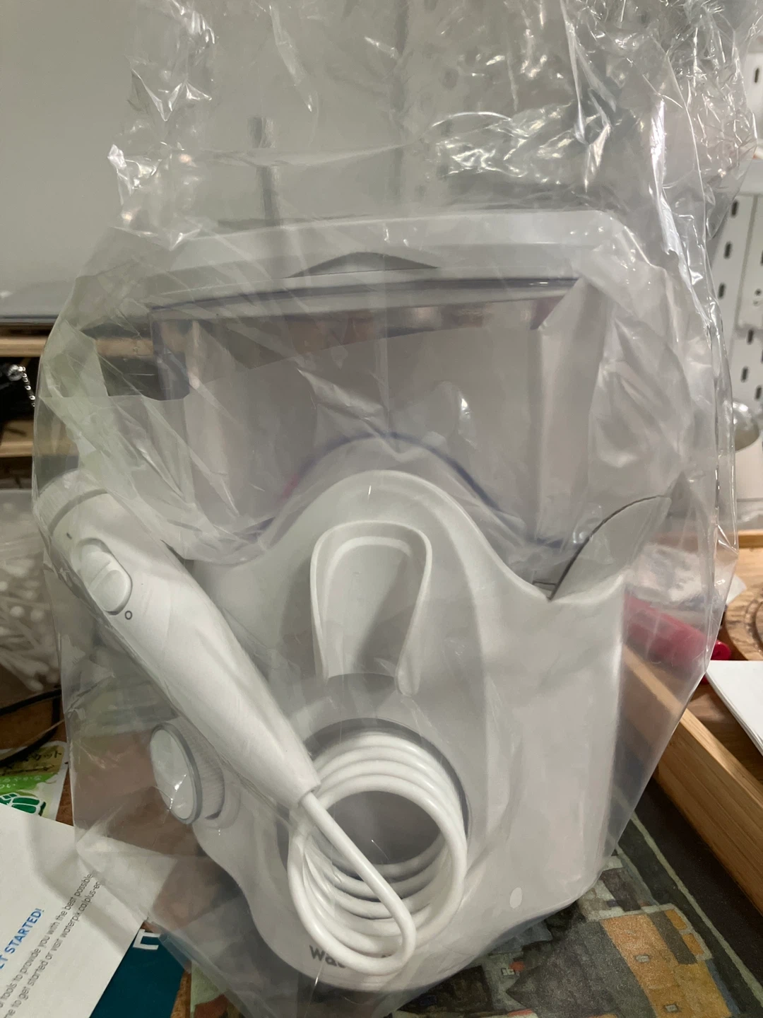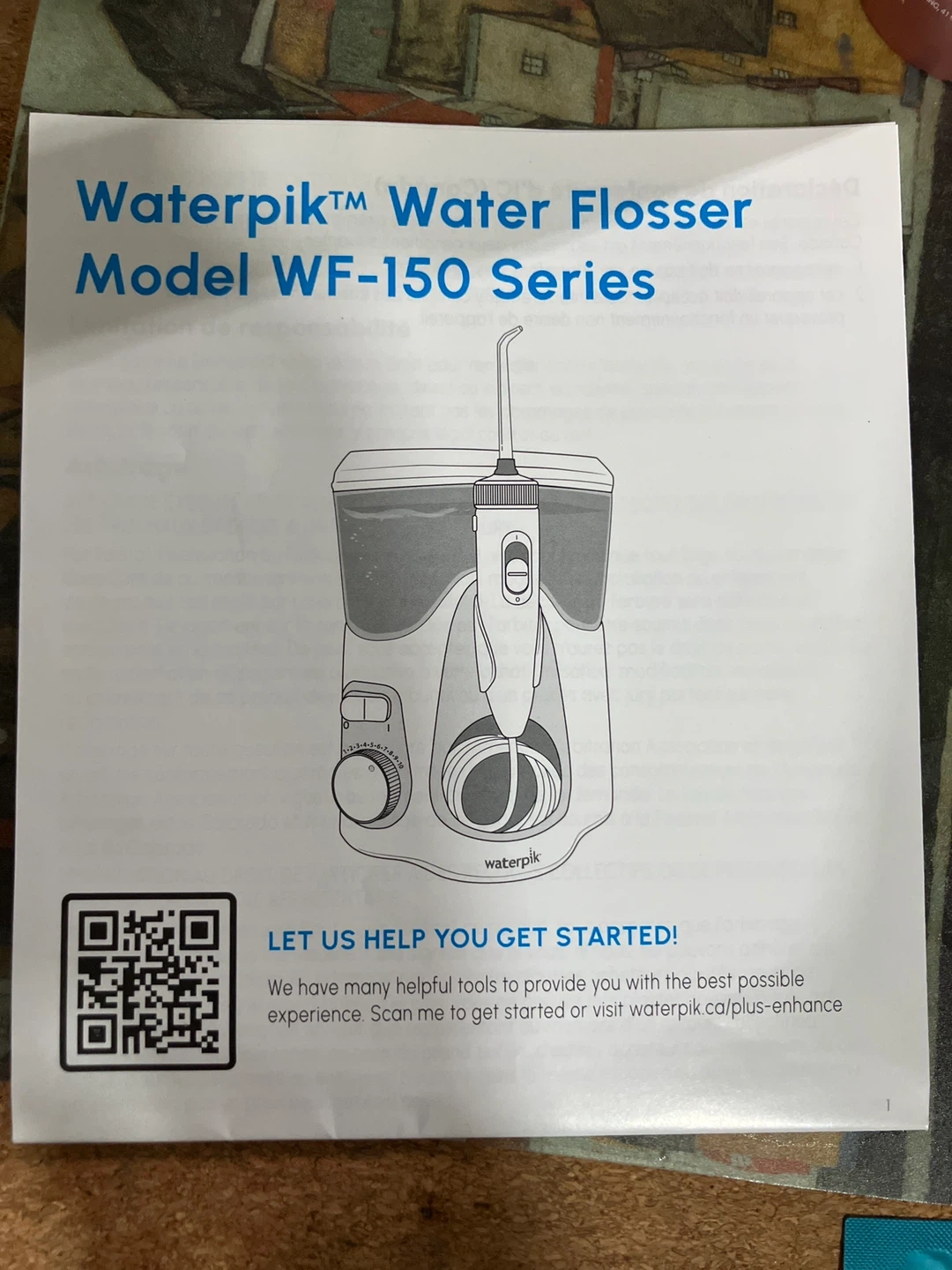This is a Waterpik Water Flosser, Model WF-150 Series. It comes with a water reservoir and a flosser handle with a coiled hose. The unit has adjustable pressure settings.
