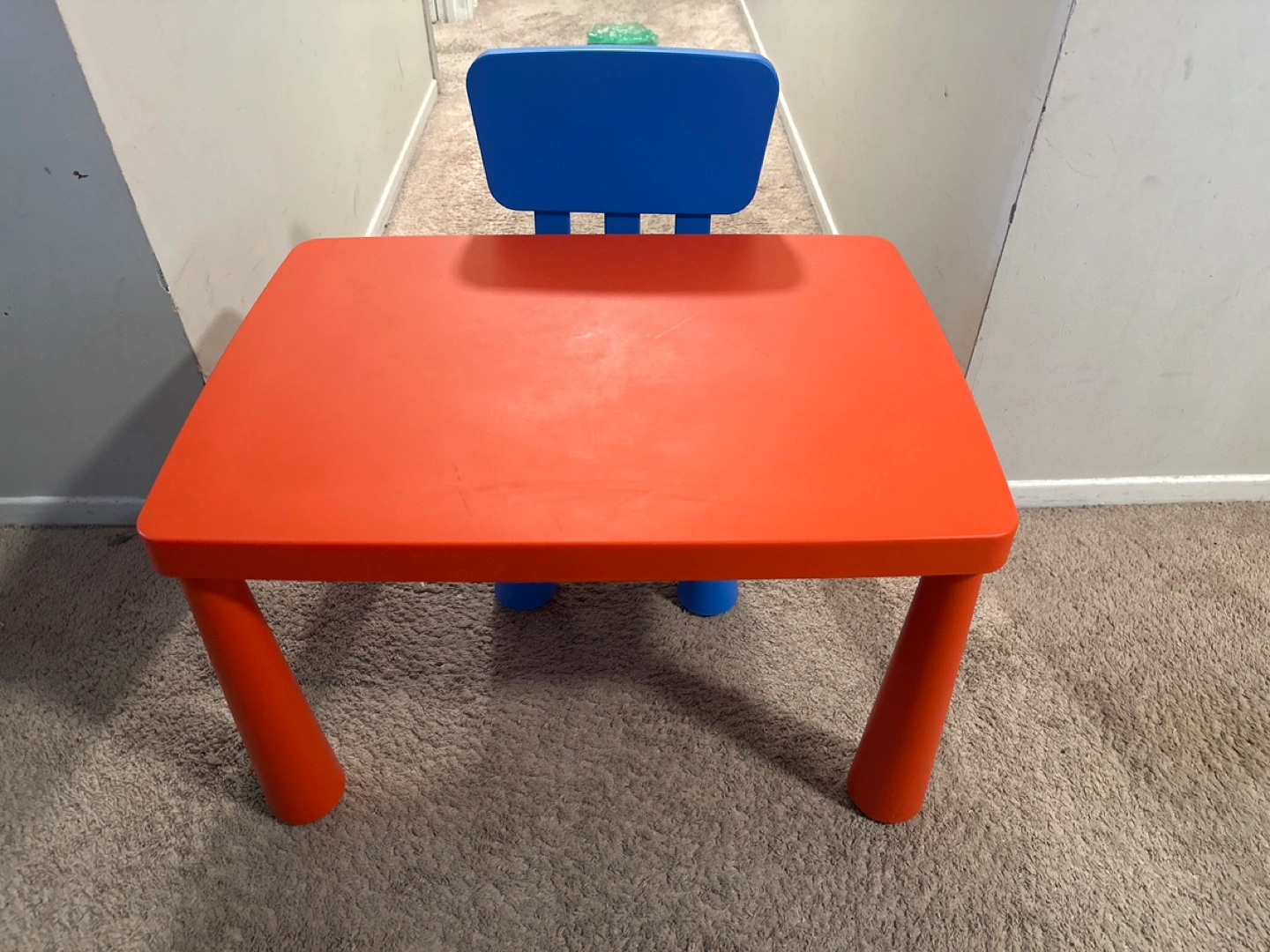 Orange table and blue chair. Plastic construction. Lightweight and easy to clean. Perfect for toddlers and preschoolers.