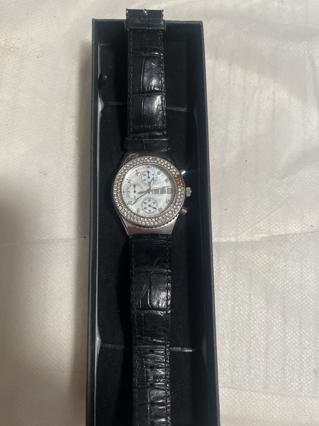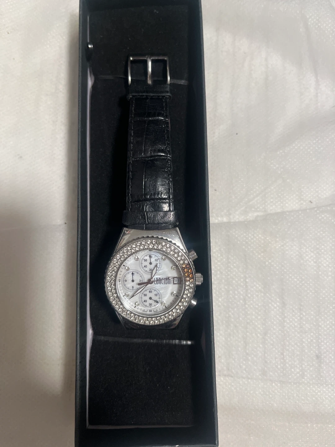 This LUDOVICI watch features a silver-tone case with a sparkling crystal bezel. It has a white dial with three subdials and a date window. The band is black, faux-croc leather with a buckle closure. Chronograph functionality included!