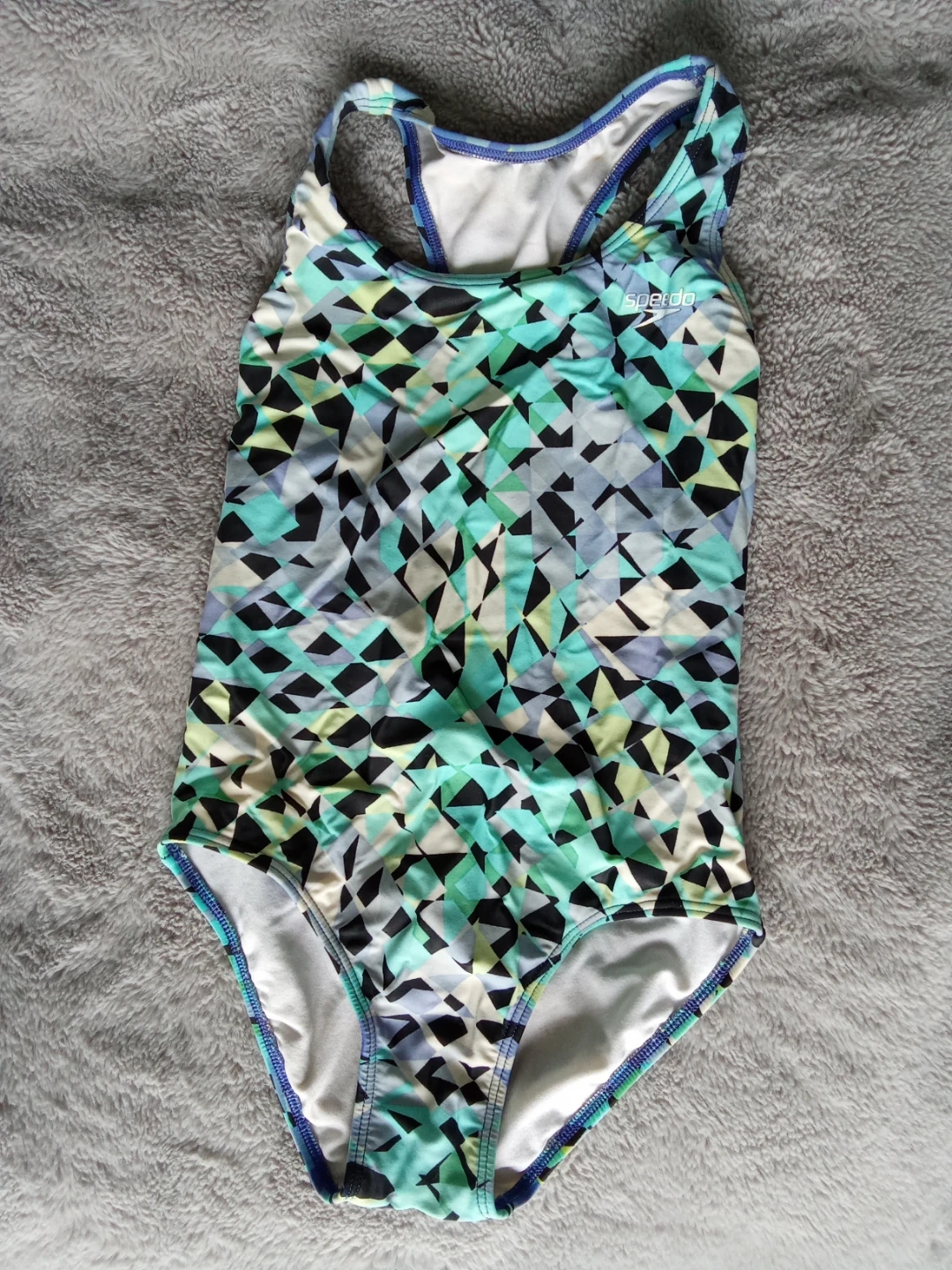 This Speedo one-piece swimsuit has a colourful geometric pattern. It's designed for active wear with a racerback style. Perfect for swimming lessons or recreational use!