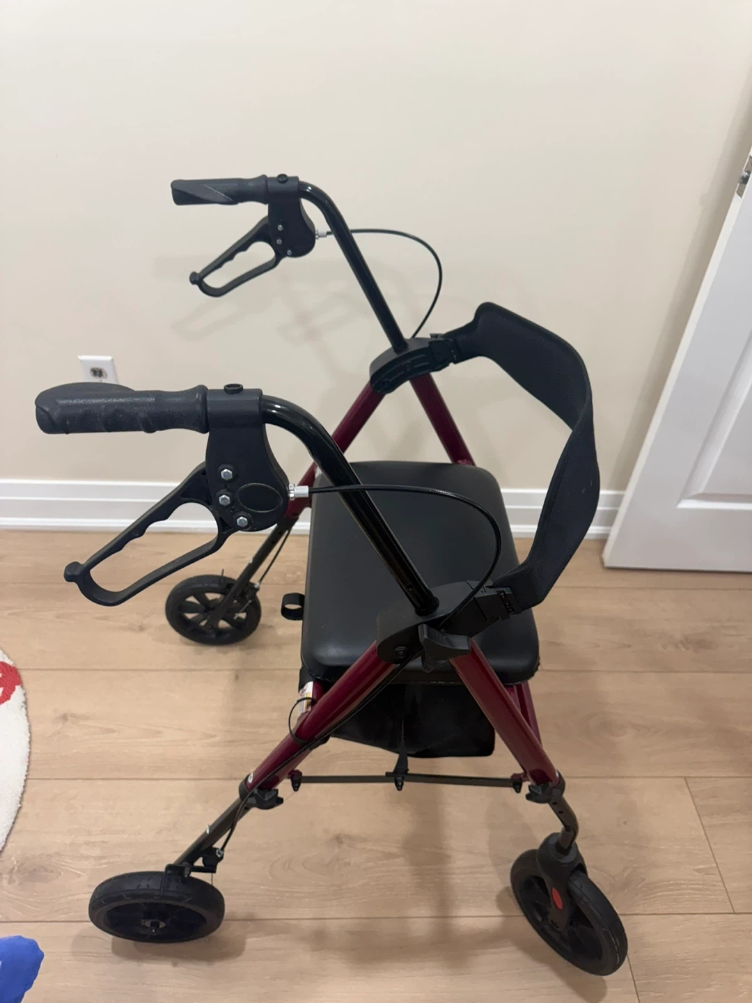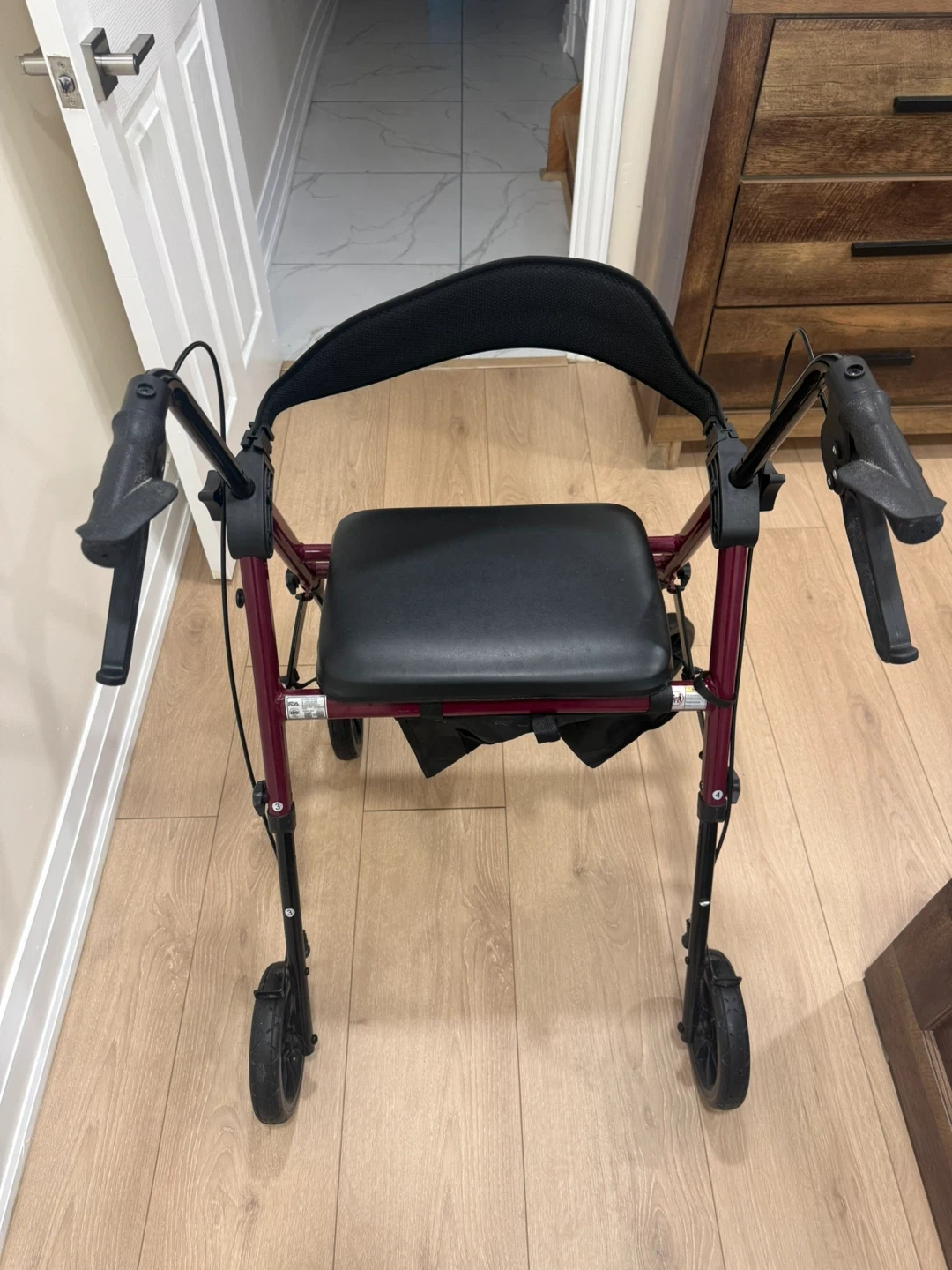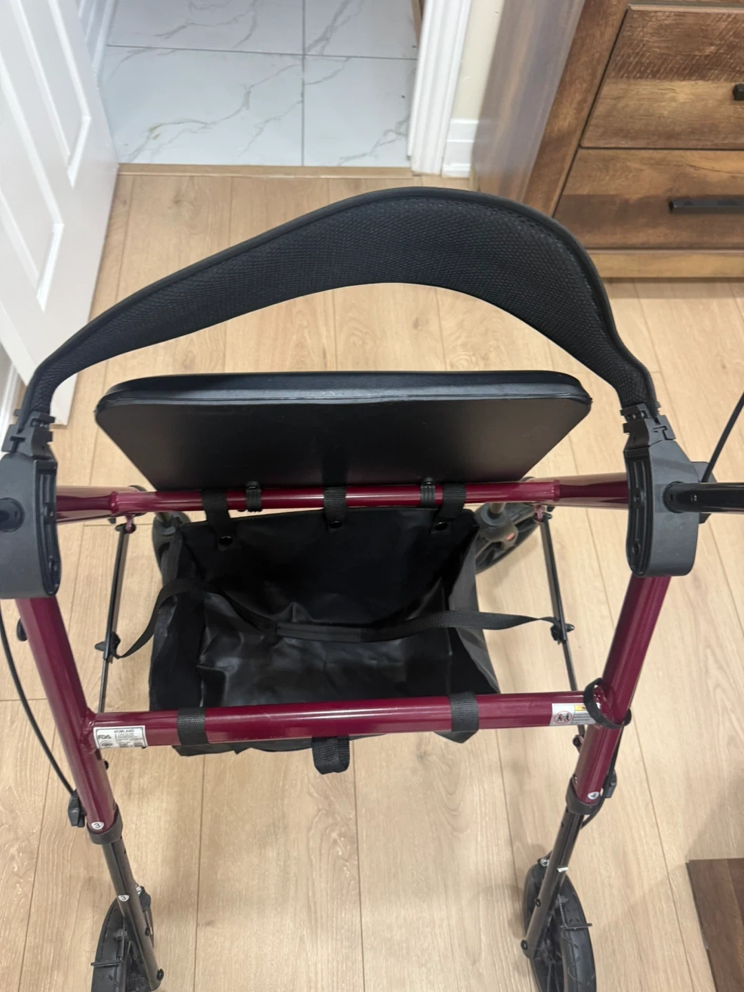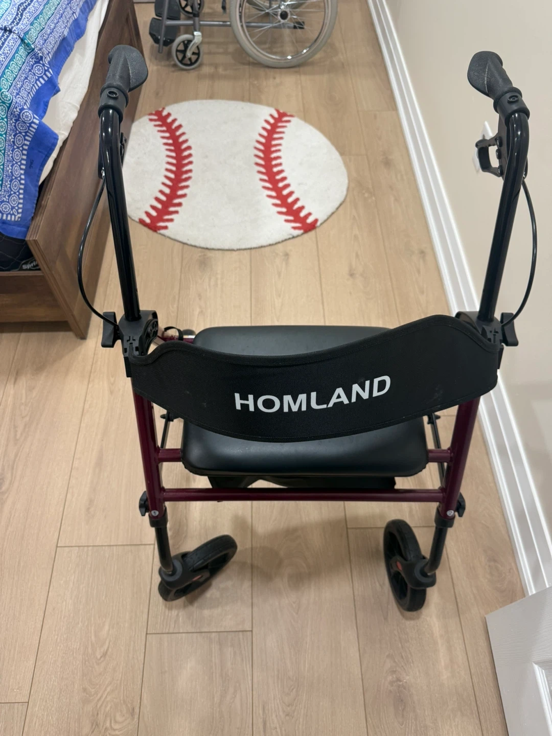 This HOMLAND rollator walker offers a comfortable seat and a convenient storage bag. It's designed for mobility assistance. It features adjustable handles and easy-to-use brakes for safety.