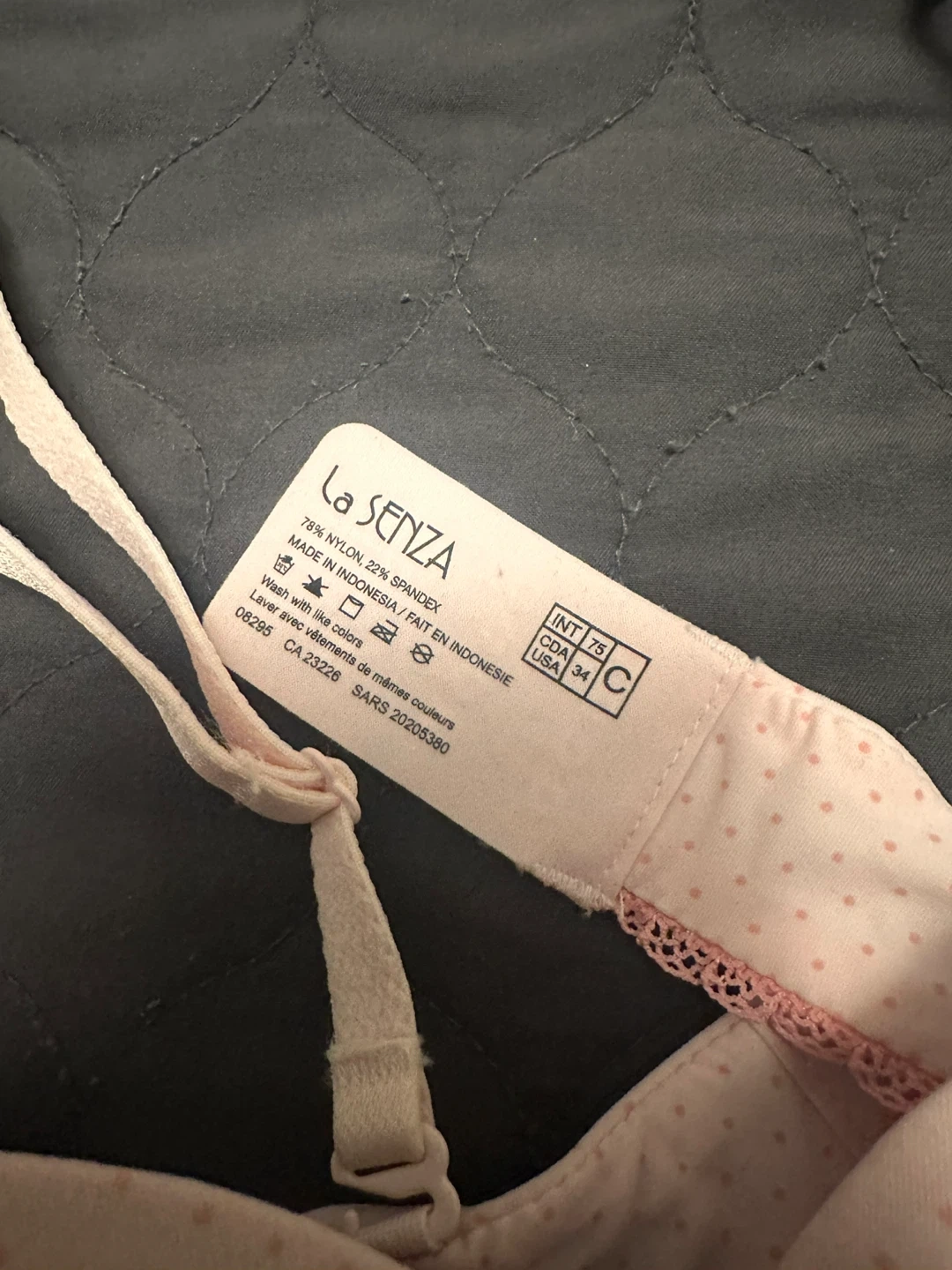 This is a pink La Senza bra with a polka dot pattern. It's made from 78% nylon and 22% spandex. It features adjustable straps and a bow accent. This bra is a size 34C.