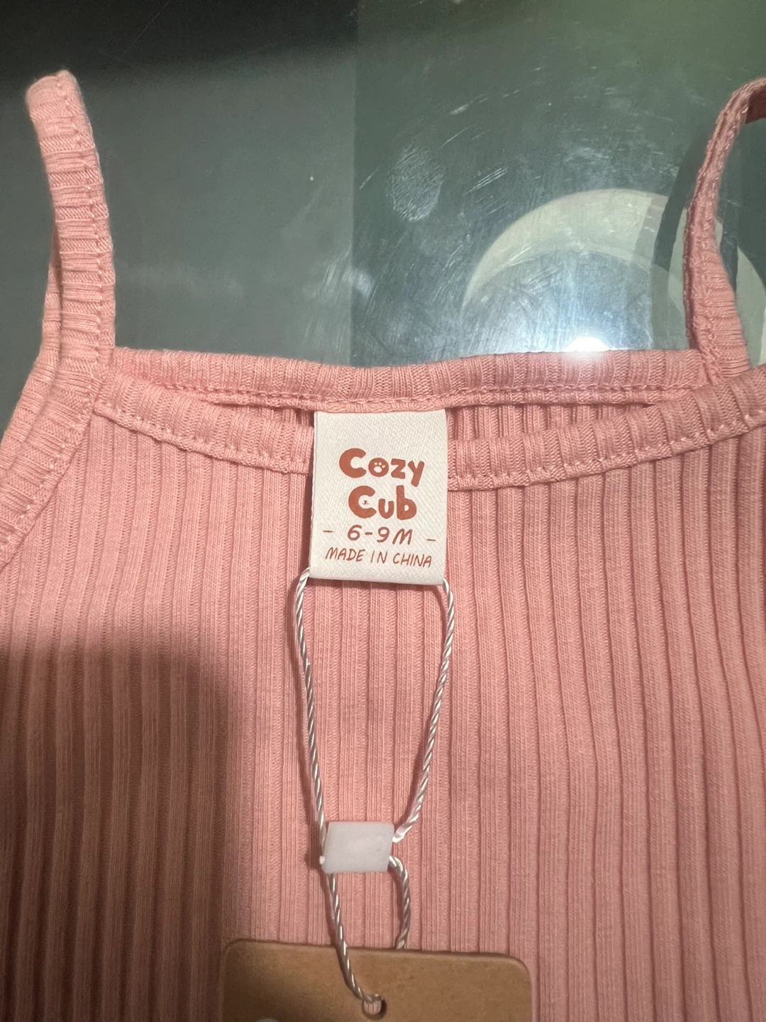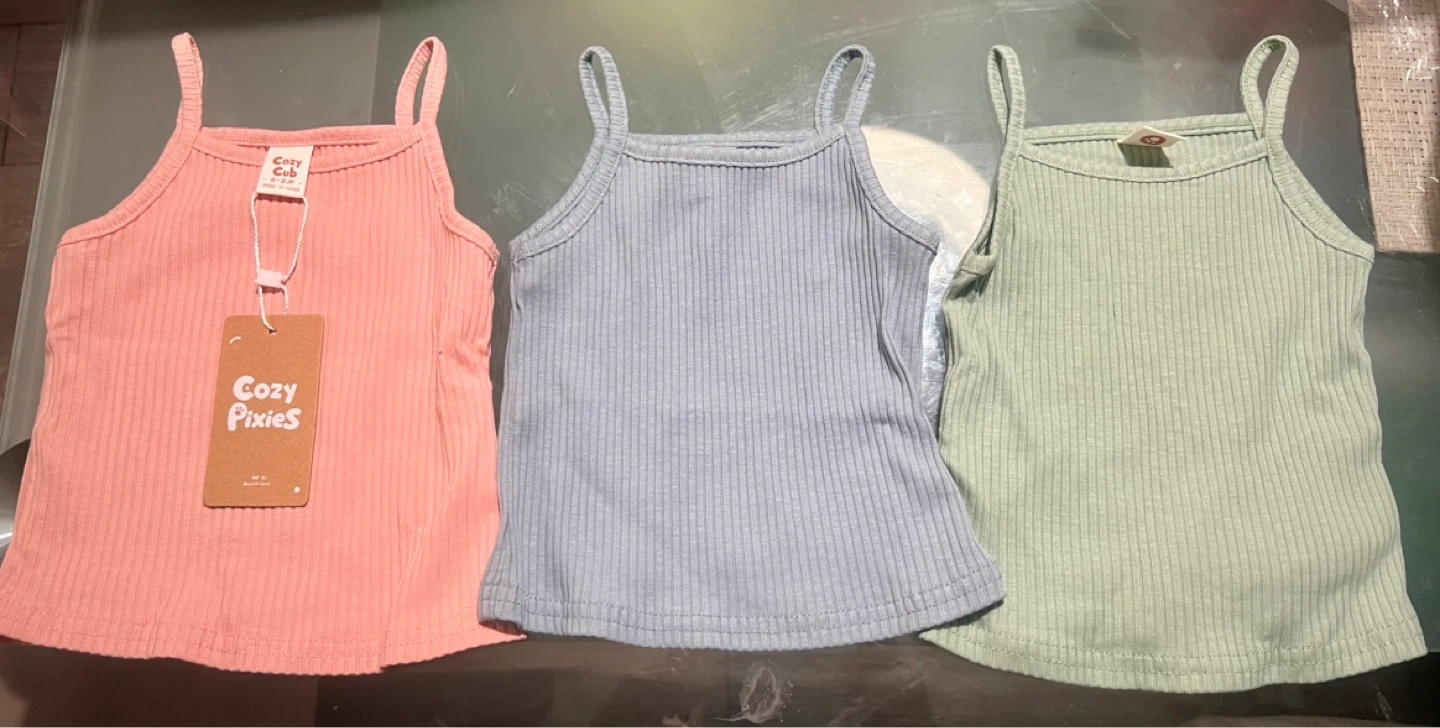 Three ribbed tank tops for baby girls from Cozy Cub. Includes one pink, one grey, and one light green. Size 6-9 months. Made from soft, breathable fabric.