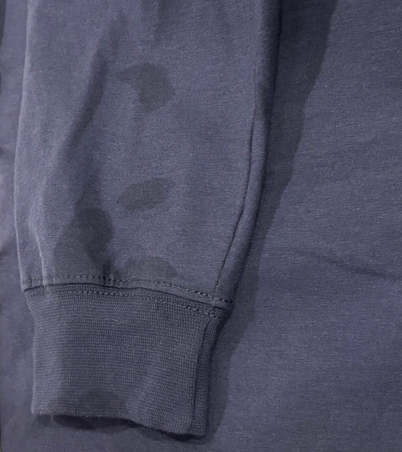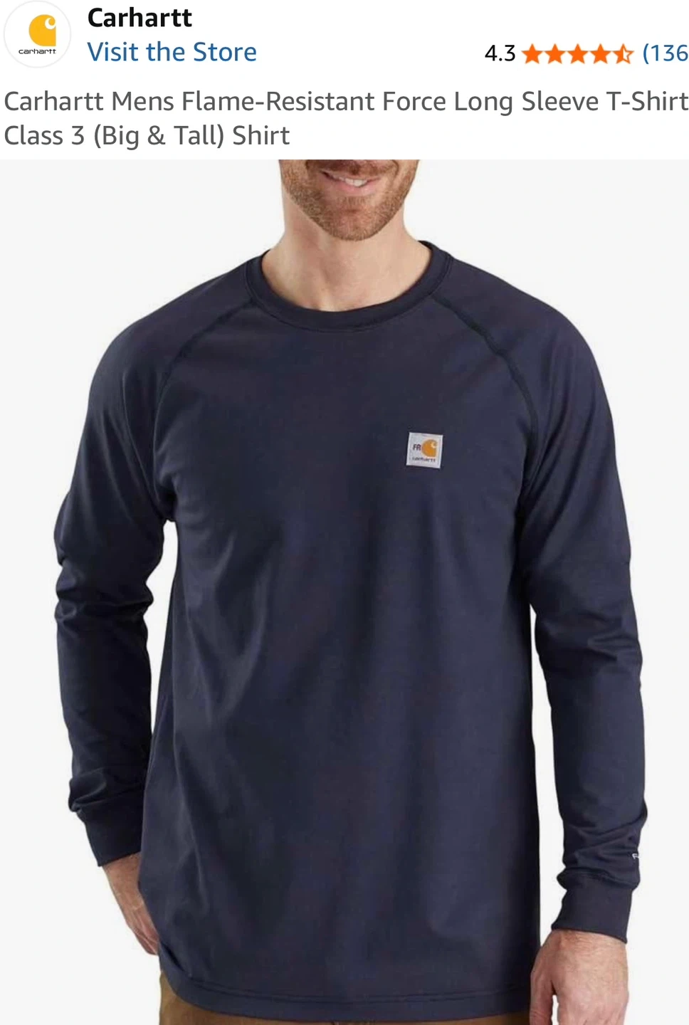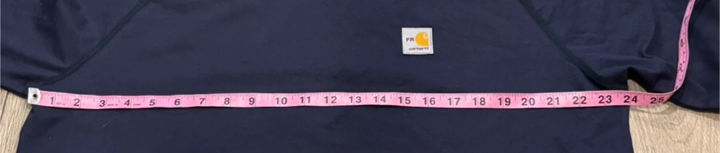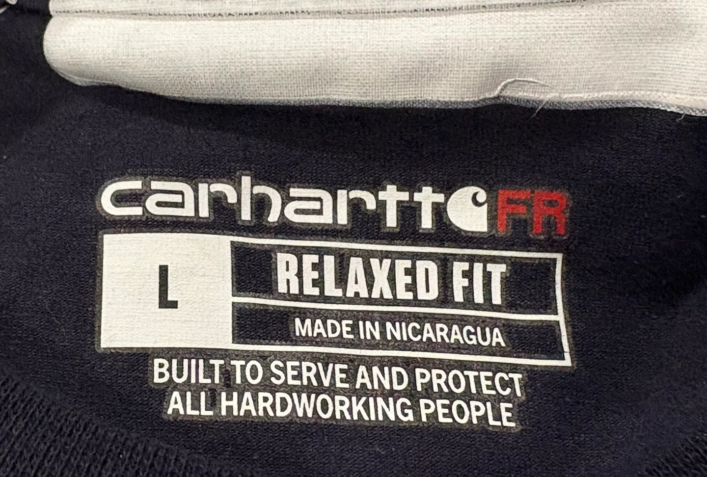 This Carhartt flame-resistant long sleeve t-shirt is navy and size L. It's built to serve and protect hardworking people. The garment is constructed from fabric that is self-extinguishing upon removal from a flame source. It's made in Nicaragua. Stains on sleeve