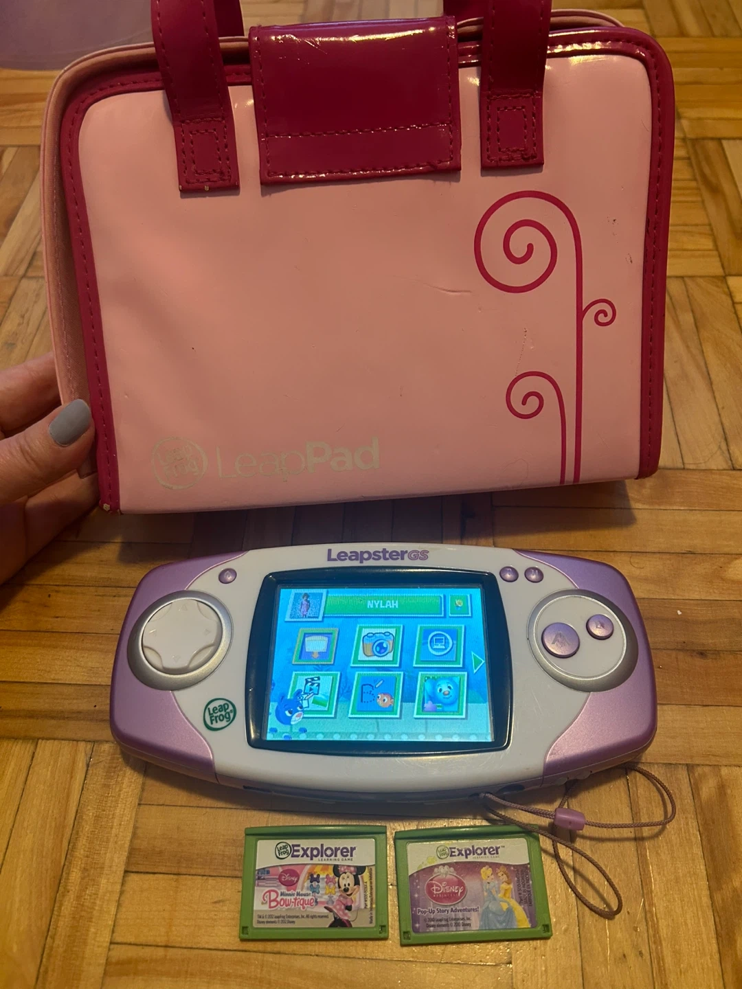 This Leapster GS learning system comes with a pink and purple carry bag and two Explorer games. It's great for kids to learn with interactive play. Includes Minnie Mouse Boutique and Disney Princess Pop-Up Story Adventures games.