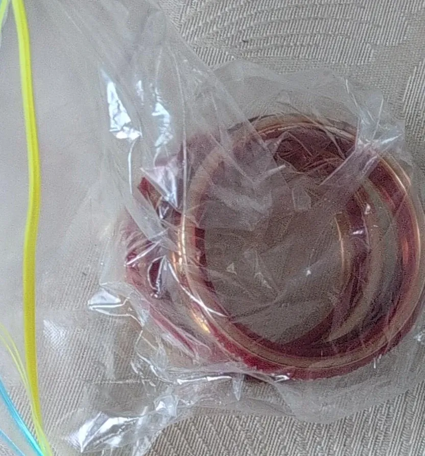 These are a set of six bangles with red and gold colouring. They appear to be made of metal. Stack them for a bold look!