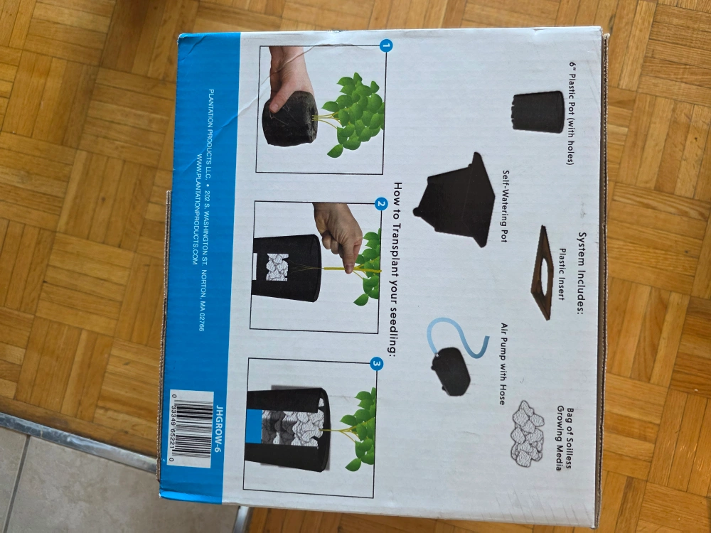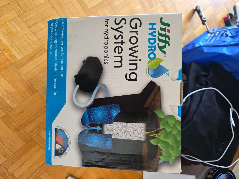 Selling a Jiffy Hydro Growing System for hydroponics, perfect for growing young to mature plants indoors! It includes: - 6 plastic pots with holes - A self-watering pot - A plastic insert - An air pump with hose - A bag of soilless growing media
