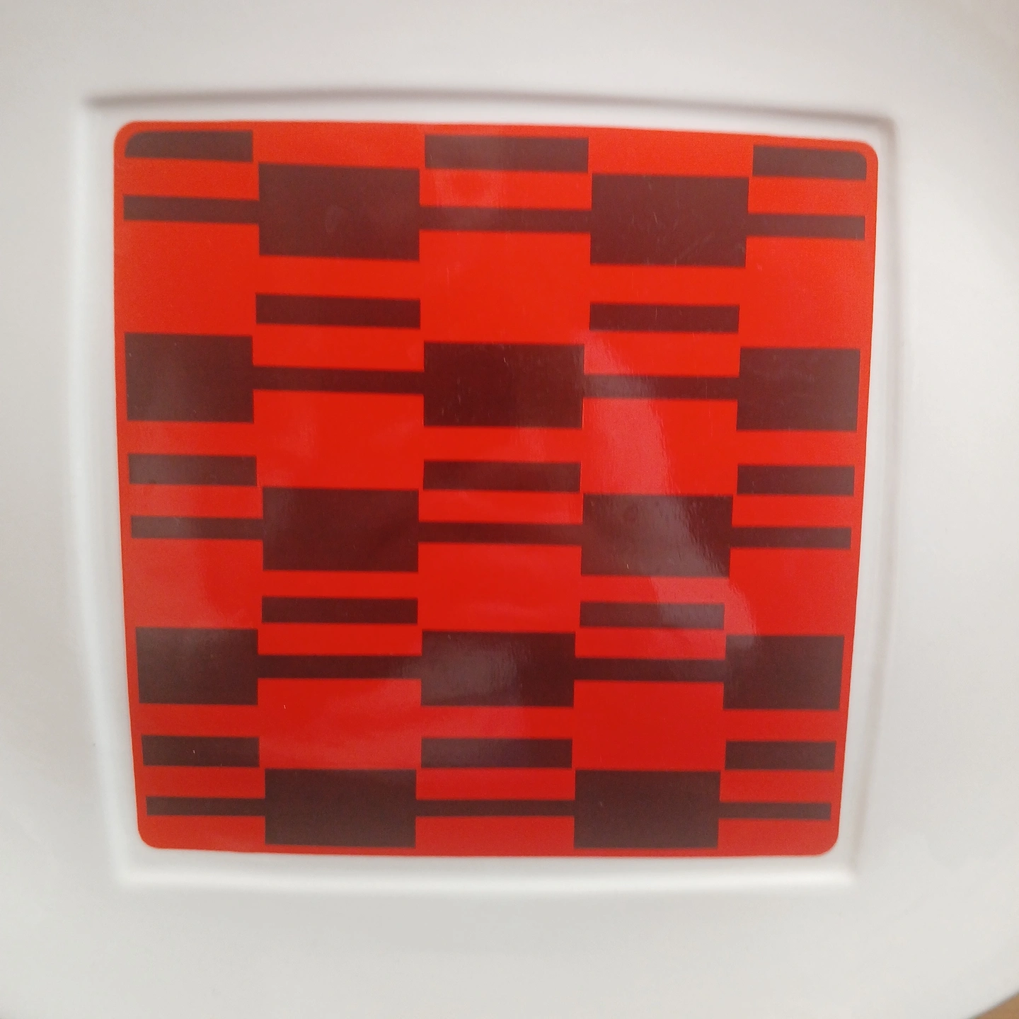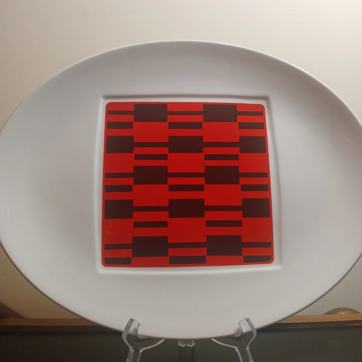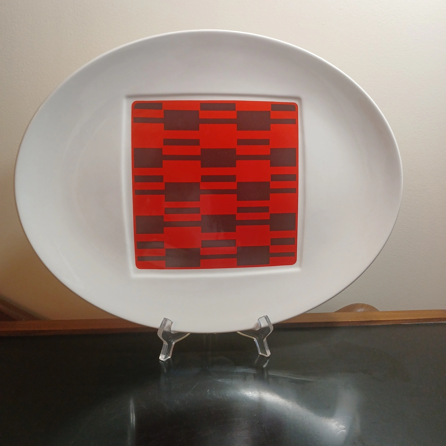 The Mid Century Johnson Brothers Khayyam Pattern Platter is not just a piece of dinnerware; it is a stunning testament to the artistry and innovation of mid-century modern design. Crafted from durable ironstone in England, this vintage platter showcases a captivating geometric pattern of rich brown blocks and bars against a vibrant red square inset, making it a striking centerpiece for any table setting.