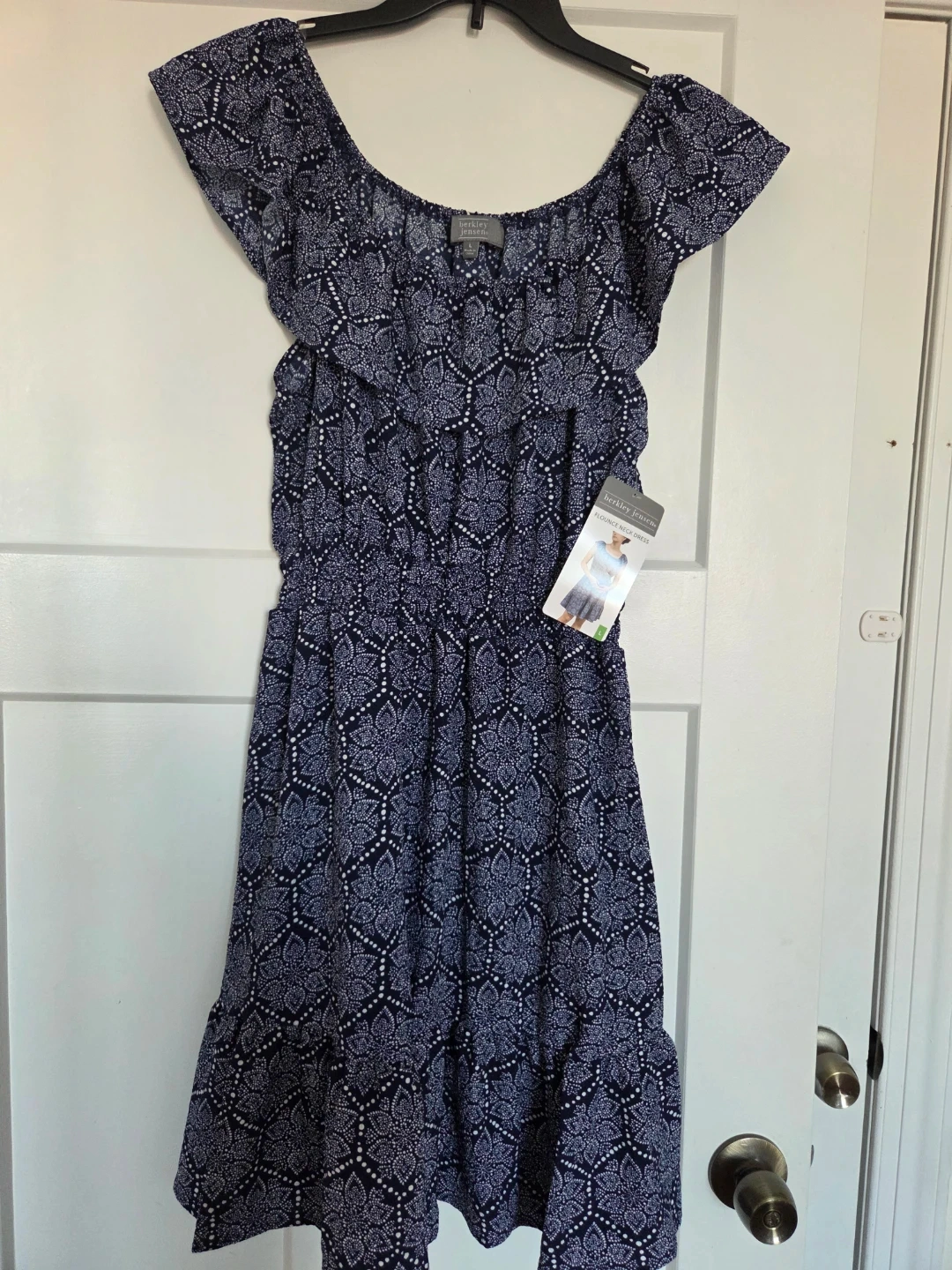 This is a floral print midi dress from Lucky Brand. It's a tan color with a repeating red floral pattern. The dress has a collared neckline and a tie belt. It's perfect for a casual outing or can be dressed up for a more formal occasion!
