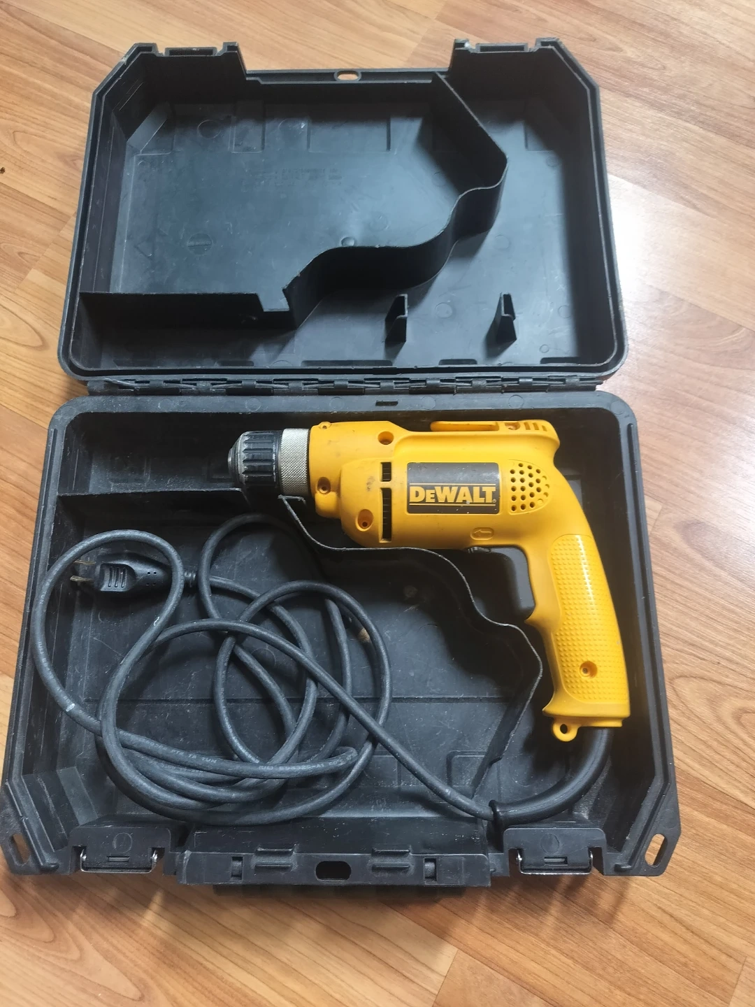 This is a yellow DeWalt corded drill that comes with its original black carrying case. It's a handy tool for various projects around the house! The drill has a cord for power.