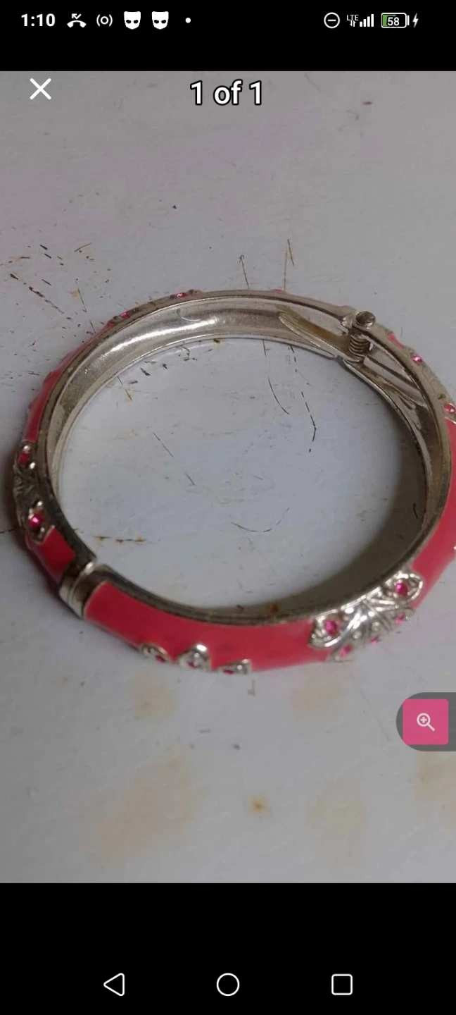 A pretty pink and silver tone hinged bangle bracelet is adorned with small rhinestones. It features a secure clasp for easy wear. This bracelet adds a pop of colour and sparkle to any outfit!