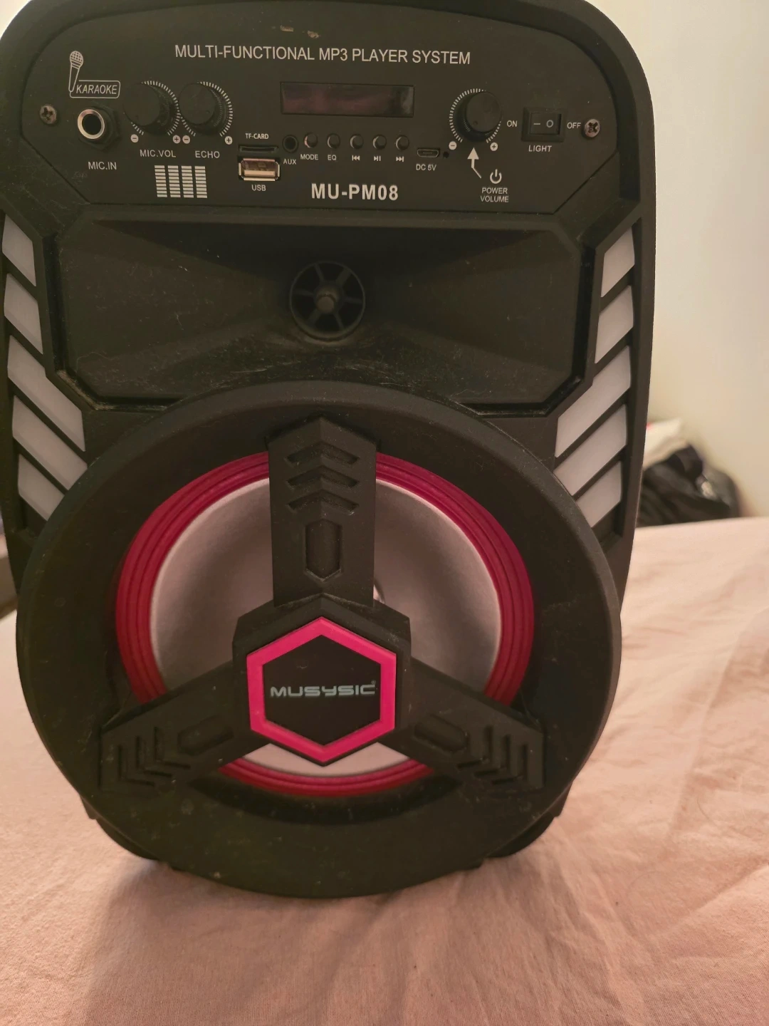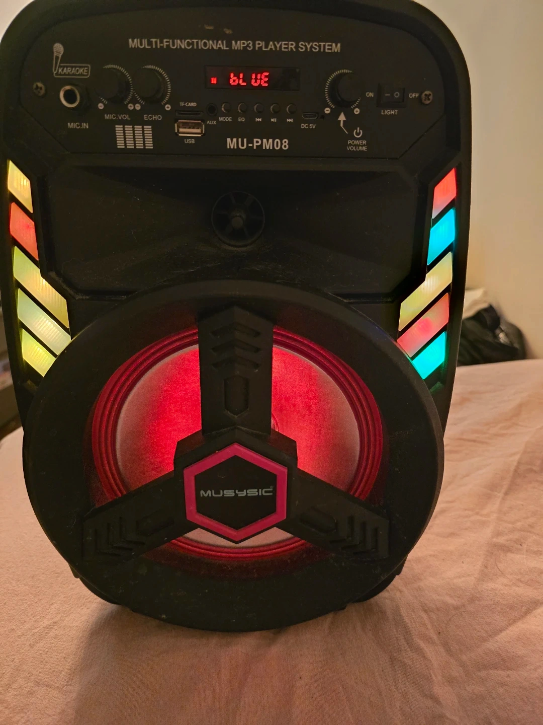 This MUSYSIC speaker is a multi-functional MP3 player system. It has inputs for microphone and auxiliary, along with echo and volume controls. It's portable and includes LED lighting effects.
