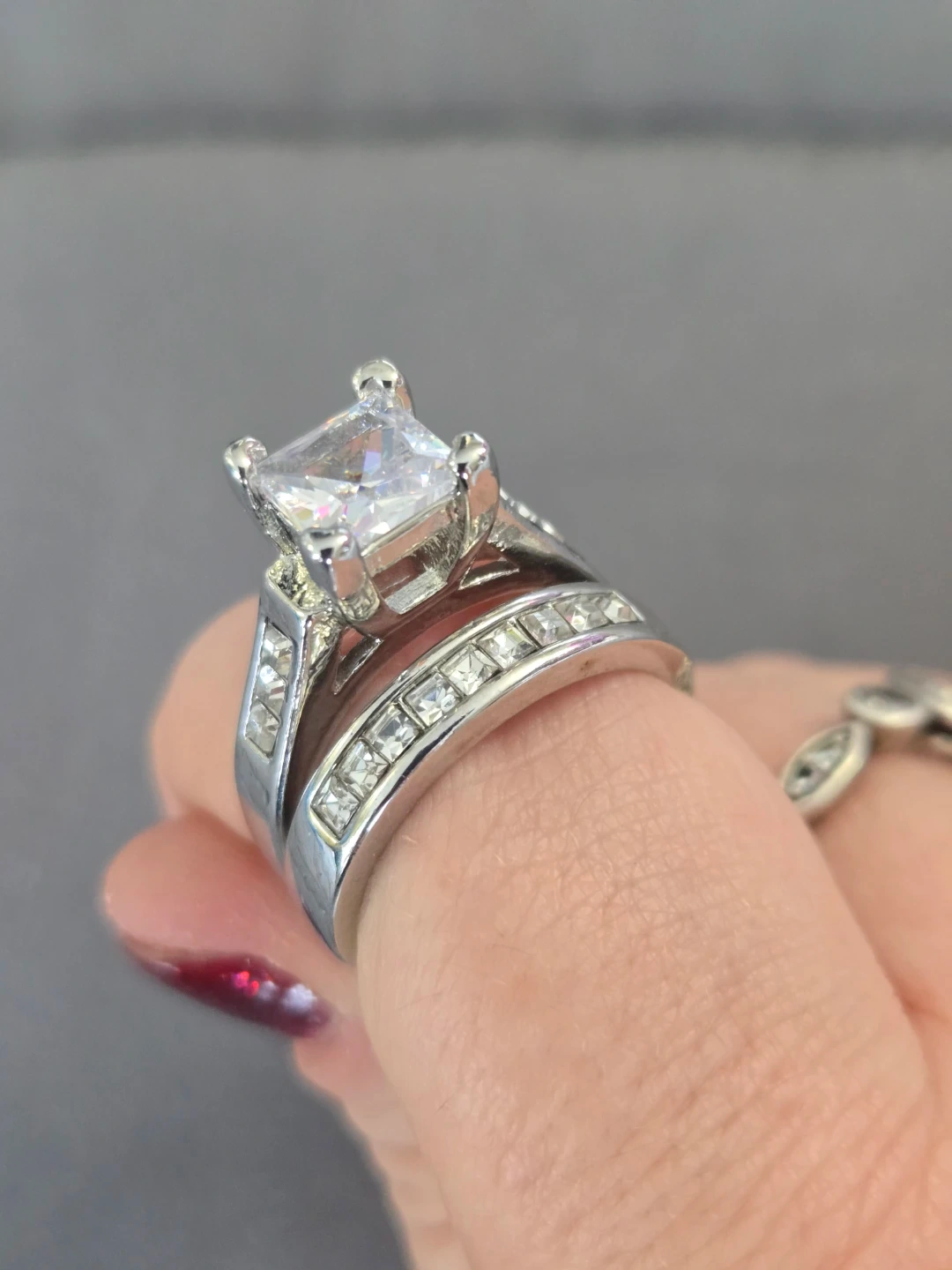 A sparkling engagement ring featuring a princess-cut centre stone and a channel-set band. It's made of silver-toned metal and has small cubic zirconia stones. Both size 8. This set would make a lovely engagent and wedding set or a statement piece for any occasion!