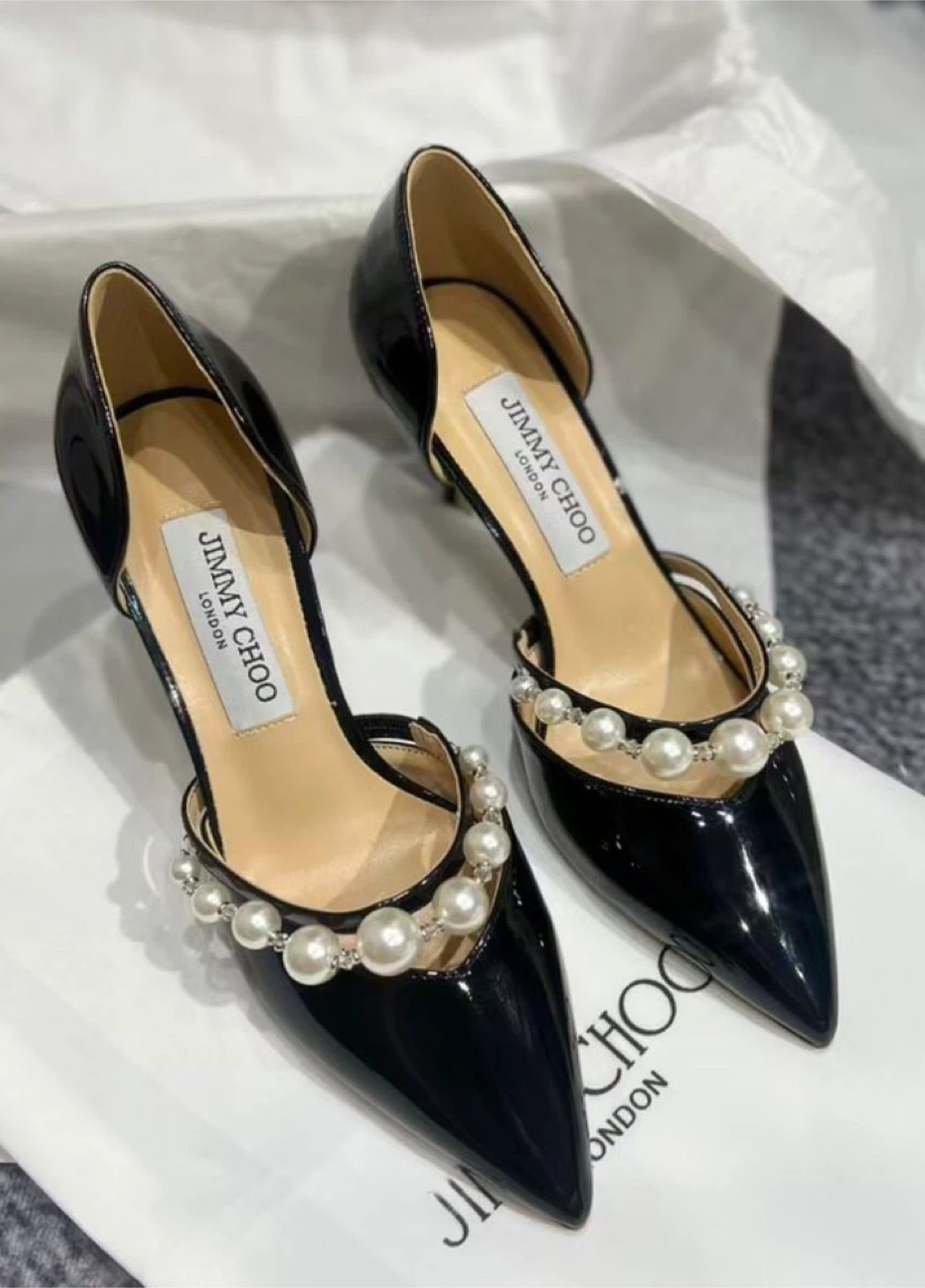 Jimmy Choo Black Patent Leather Heels with Pearls