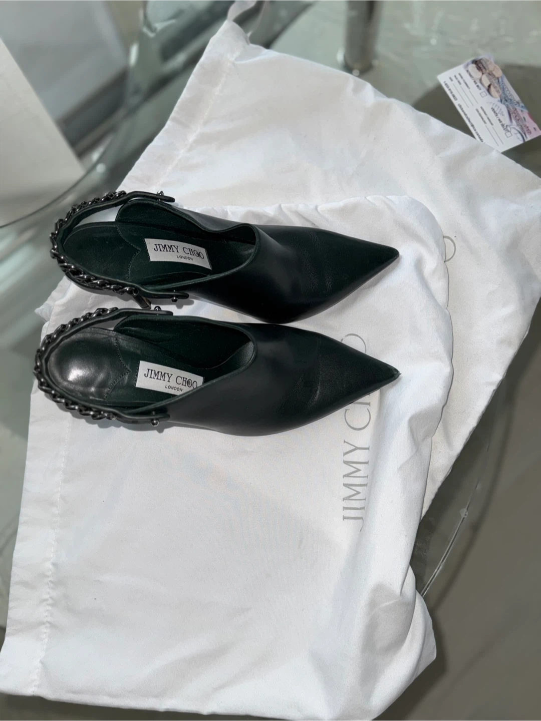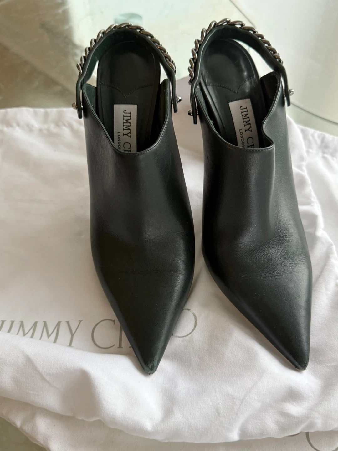 Selling a pair of Jimmy Choo heels in size 37.5. They are dark green leather heels with chain detailing. There are signs of wear on the soles but I have only worn them a few times as they are higher than what I normally wear.