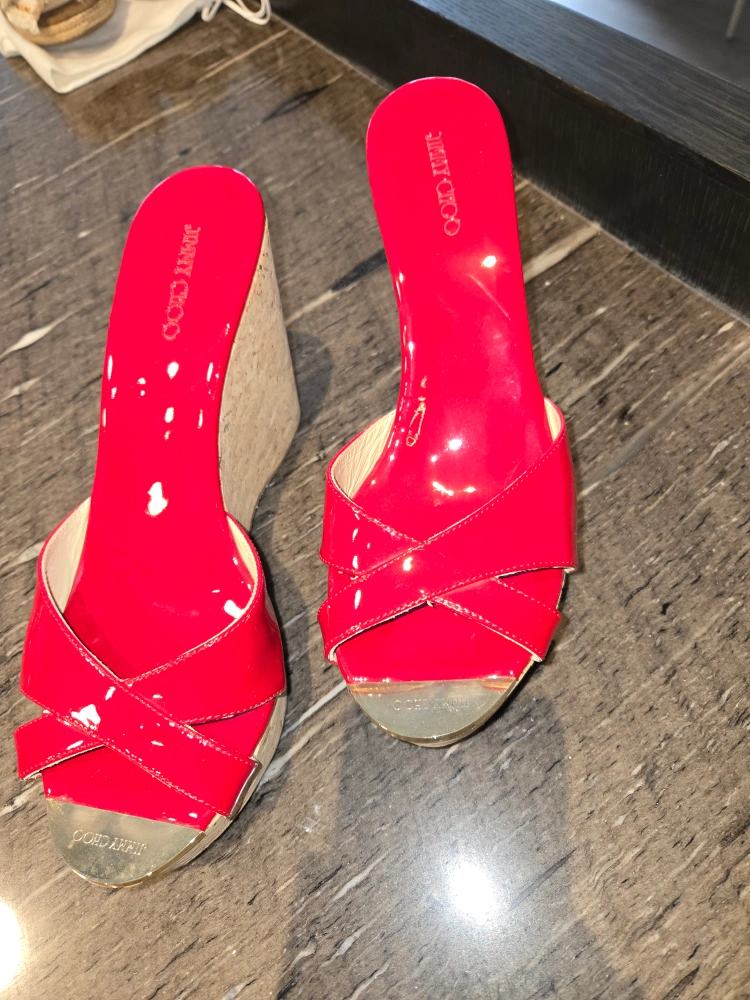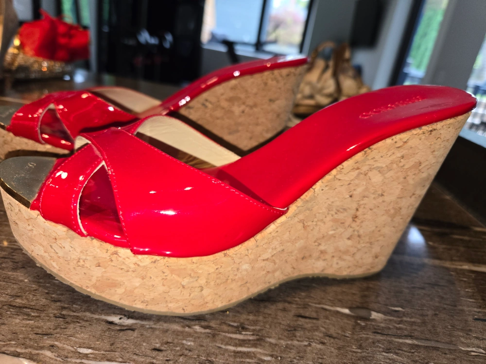 205Selling a pair of red Jimmy Choo wedge sandals. They are a vibrant red colour with a cork wedge heel. There are some signs of wear, as shown in the photos.