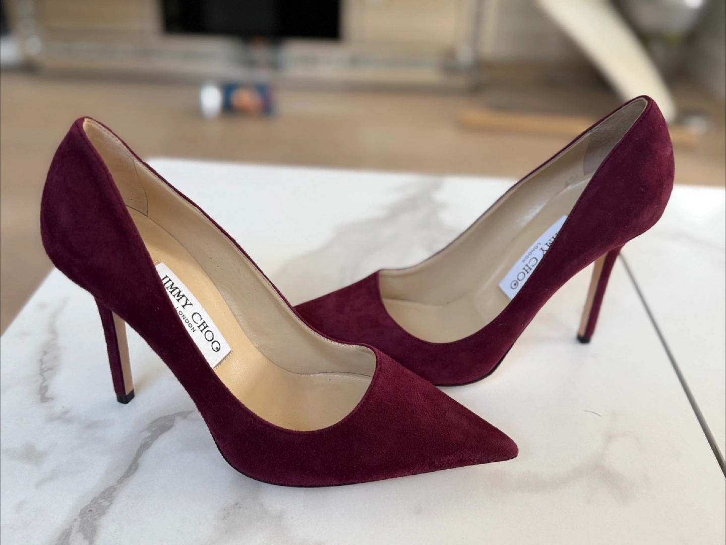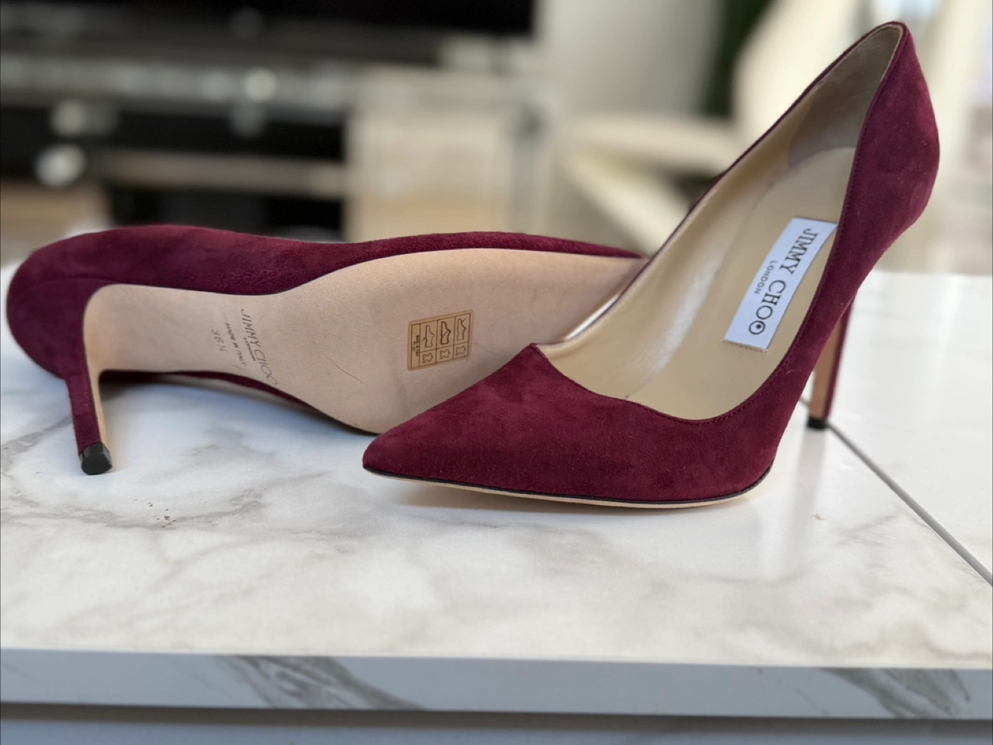 18Selling a pair of 100% authentic Jimmy Choo Romy 85 pumps in a beautiful burgundy suede! These elegant heels are a size 36.5. The screenshot shows the Romy 85 in black suede listed for $1,050. These are in great condition . Never worn No box