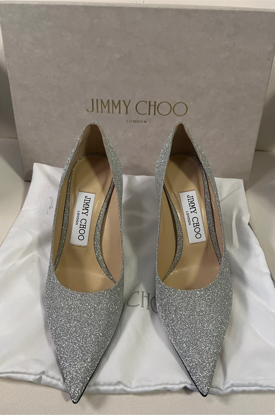 10Selling a pair of Jimmy Choo heels in a beautiful silver fine glitter shimmer finish! They are a size 35, 85cm height, brand new and come with the original box packaging. Purchased from holt renfrew. Perfect as wedding shoe and for the holidays events.
