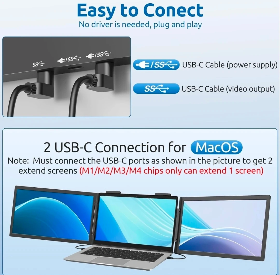 Laptop Screen Extender - 14 Inch Triple Portable Monitor IPS FHD 1080P 3-Type-C External Screen with Windows Mac Laptop Monitor Extender for Laptops Compatible, Fits 14"-16" Laptops