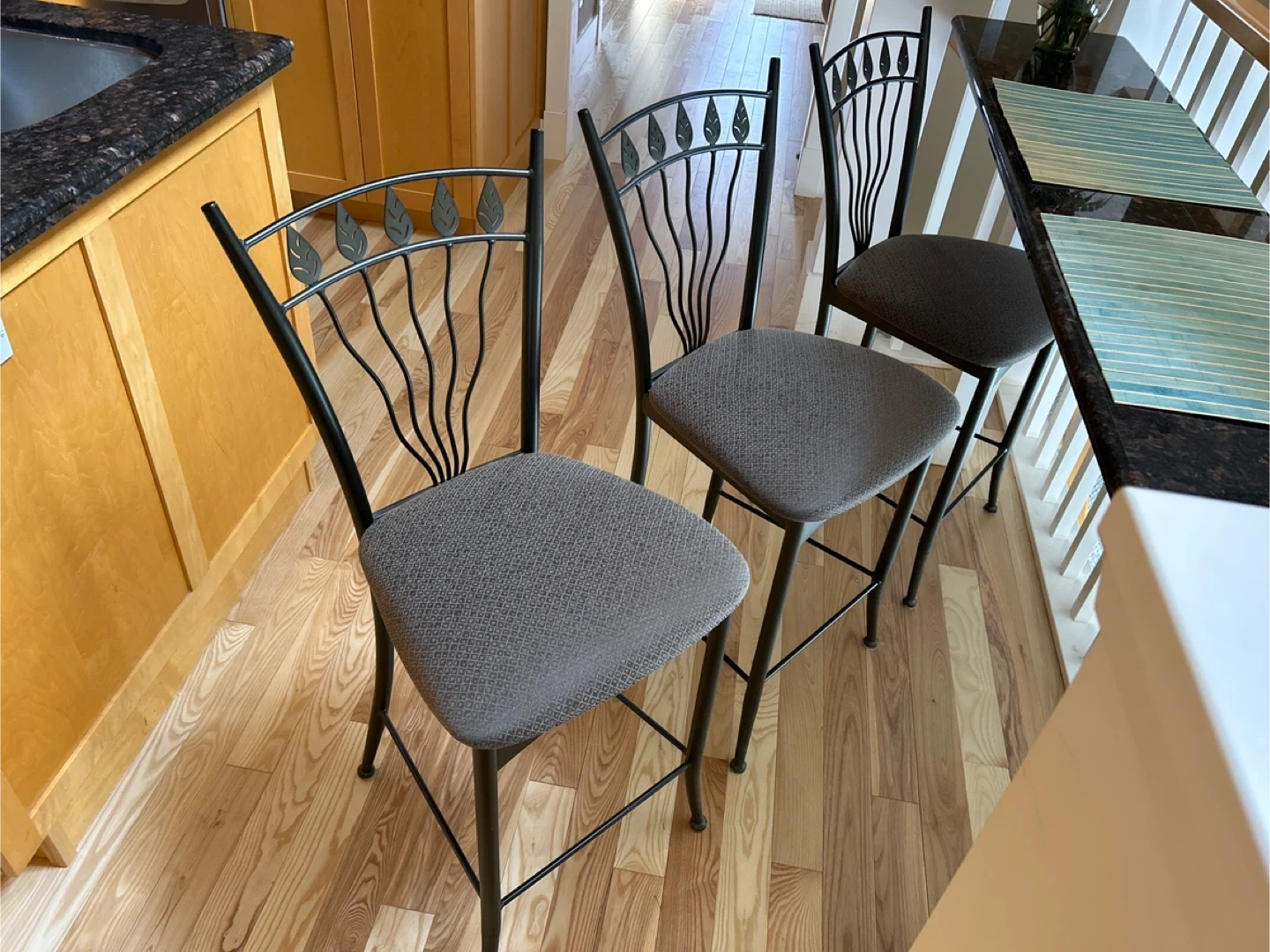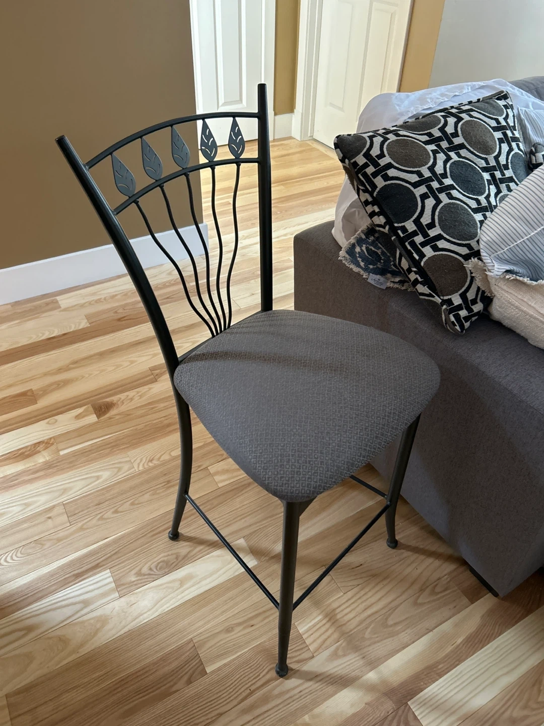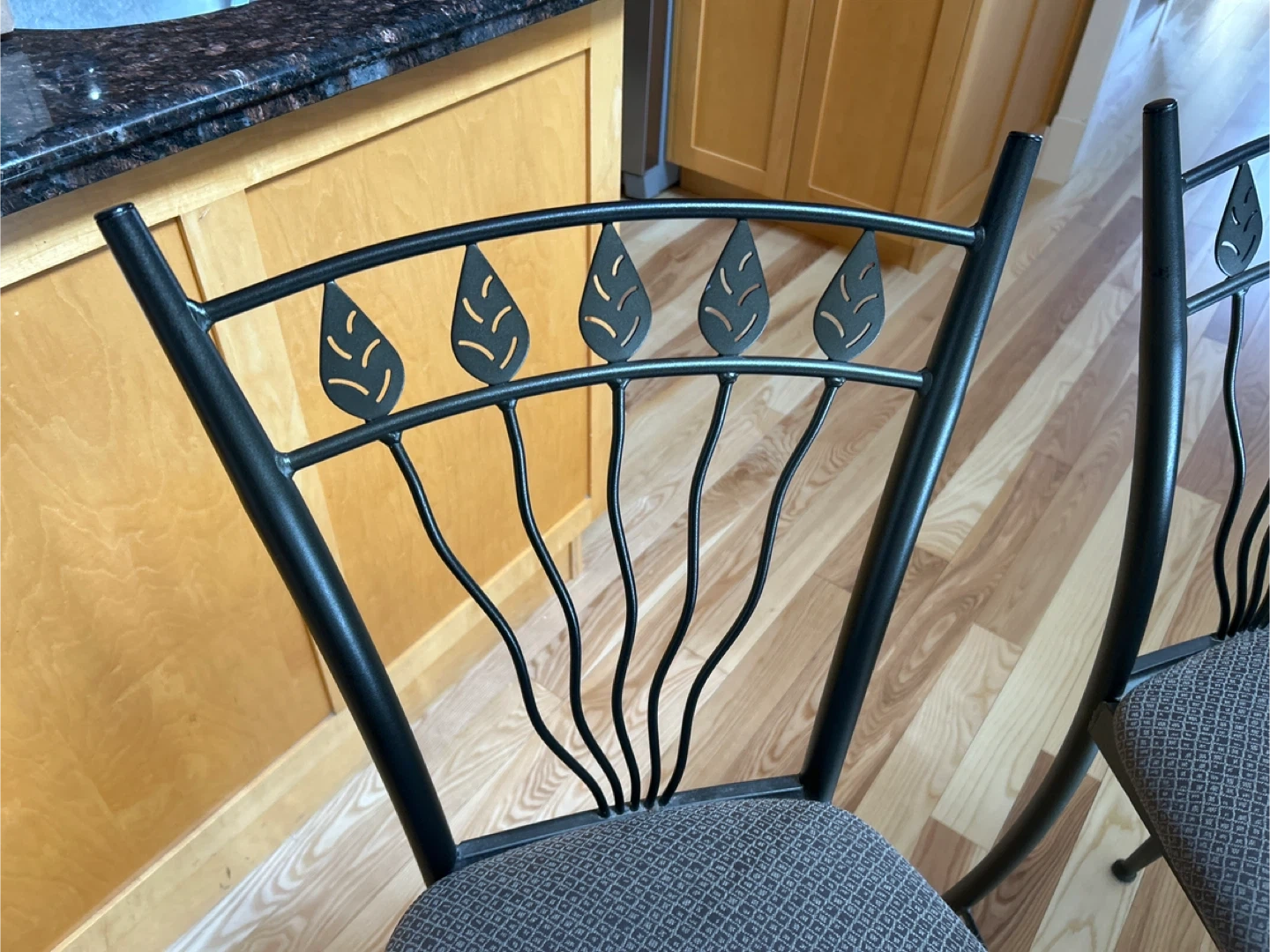 These bar stools feature a dark metal frame with a decorative leaf design on the backrest. The seats are upholstered in a textured grey fabric. They're perfect for a kitchen island or bar area. The frames are sturdy, and the seats offer comfortable seating.