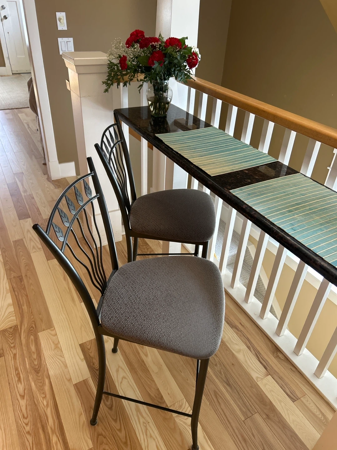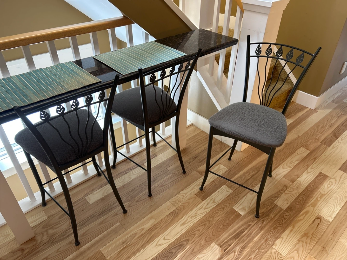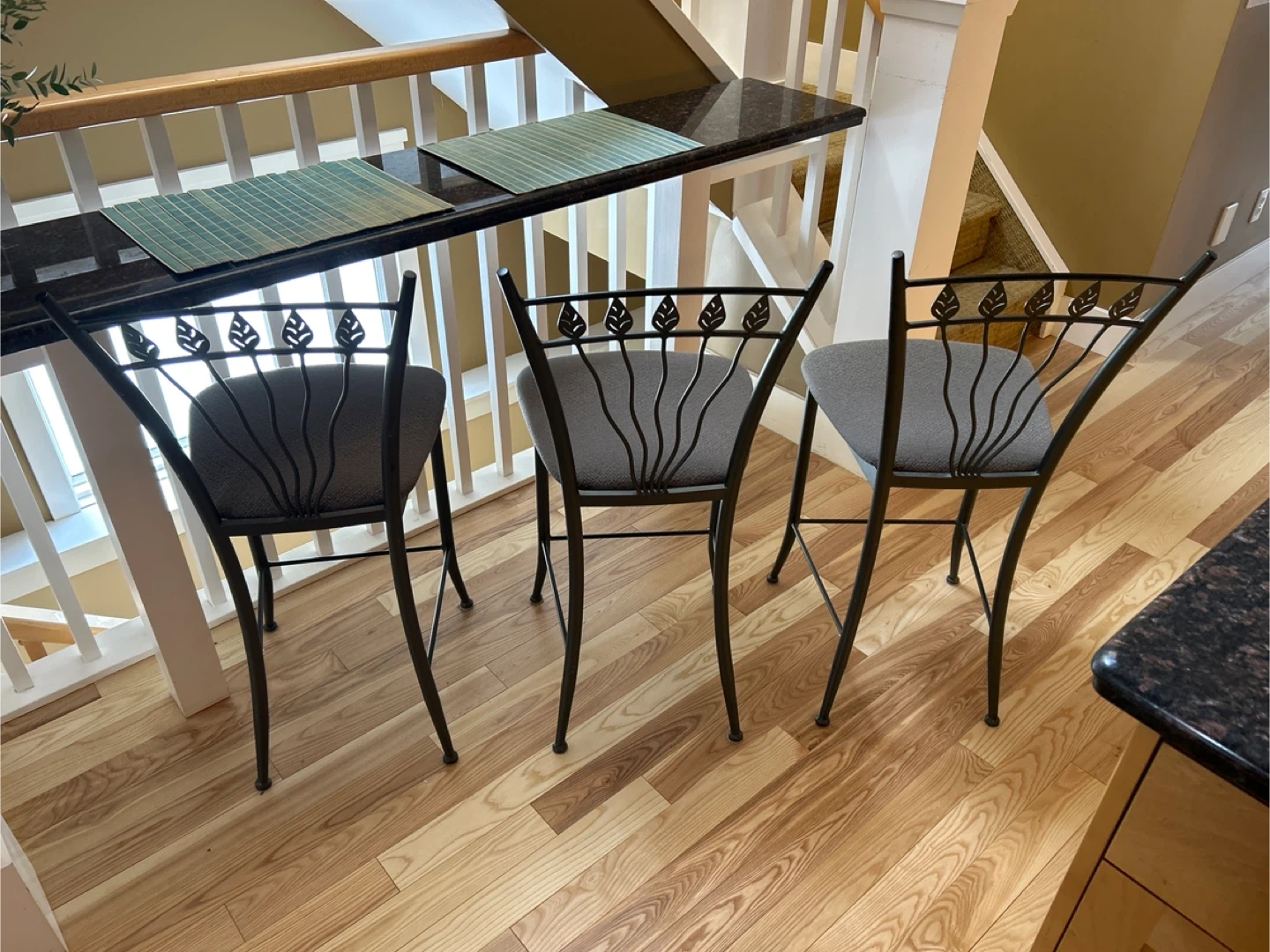 These bar stools feature a dark metal frame with a decorative leaf design on the backrest. The seats are upholstered in a textured grey fabric. They're perfect for a kitchen island or bar area. The frames are sturdy, and the seats offer comfortable seating.