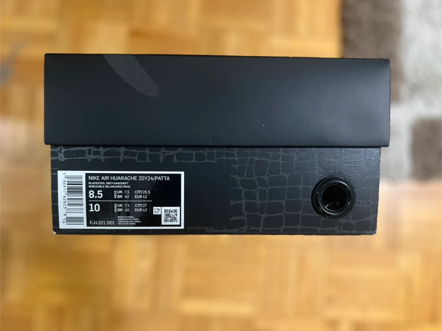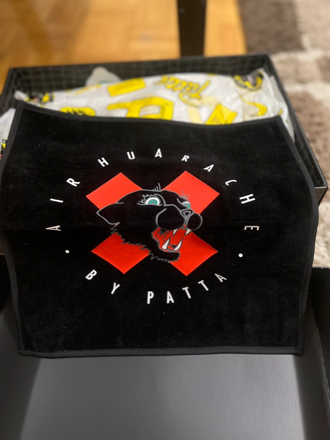 These are Nike Air Huarache sneakers by Patta in a size 8.5. They're the 20Y24 edition in black, cool grey, and sanddrift. The shoes come with the original box and a black towel featuring a Patta logo and panther graphic. It's a special collaboration piece!
