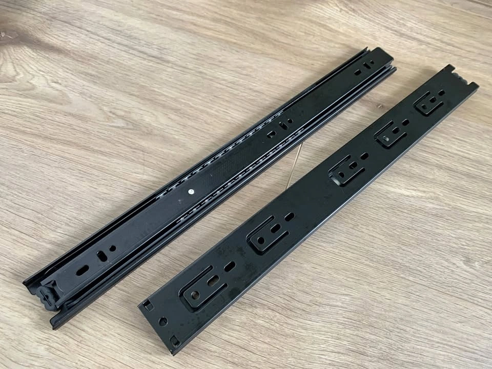 Brand new, never used black drawer slides, 16 inches (40cm) with a 100 LB capacity. They are lightweight and sturdy. Smooth and quiet rolling. Full extension and detachable. From a smoke and pet-free home. Pick up in Willoughby, Langley. CASH ONLY.