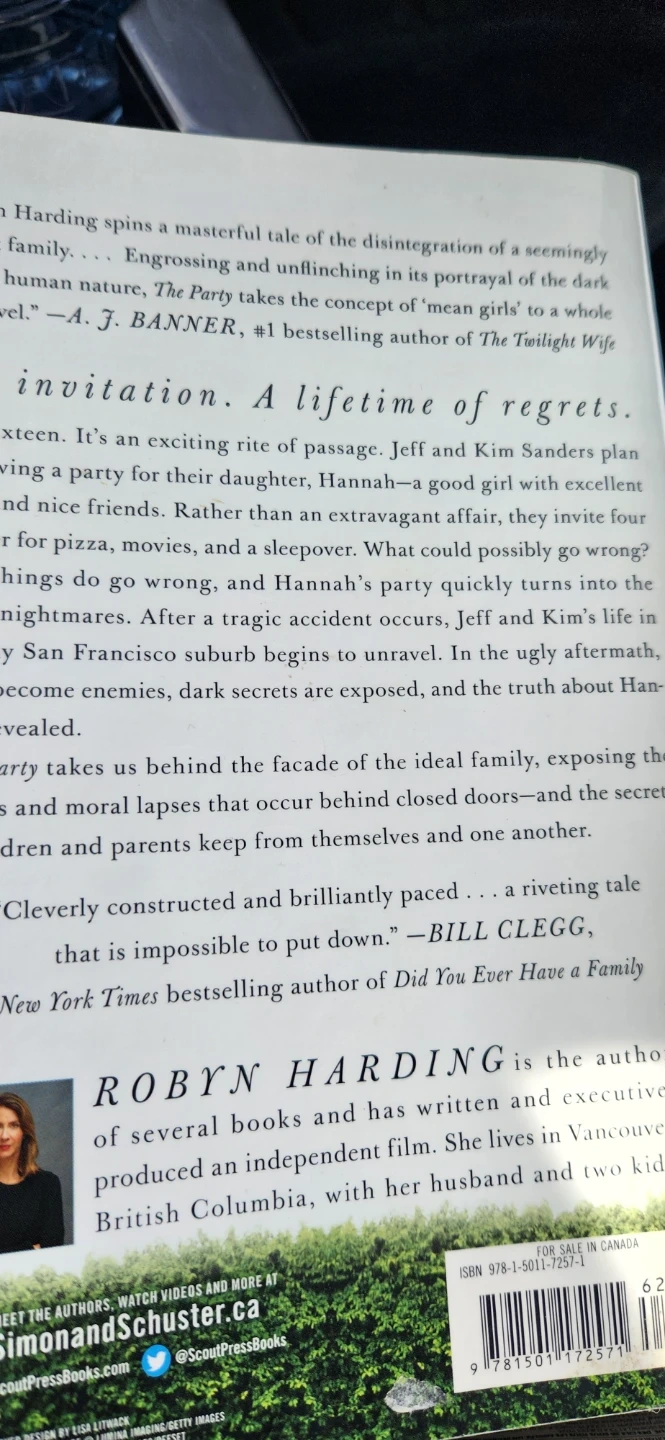 This paperback novel, "The Party," is written by Robyn Harding. It's a fictional thriller about a family gathering gone wrong. The story explores dark secrets and regrets that surface during a seemingly idyllic invitation. It's a page-turner that's hard to put down!