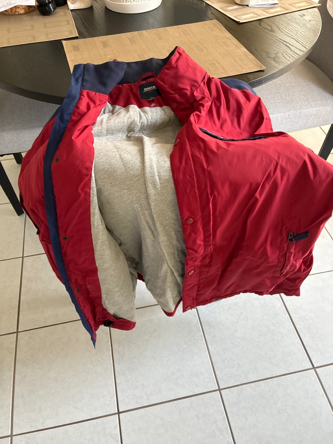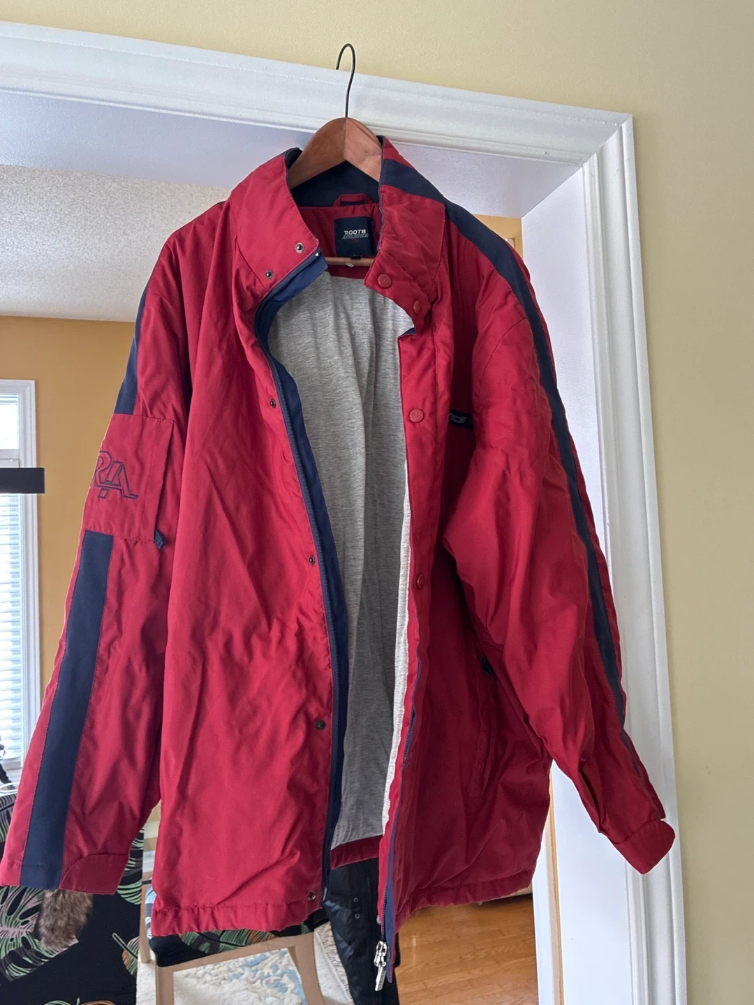 This is a Roots jacket in red with blue accents. It's made with a durable outer shell and a comfortable grey lining. The jacket features a zip and snap closure. Perfect for cooler weather!