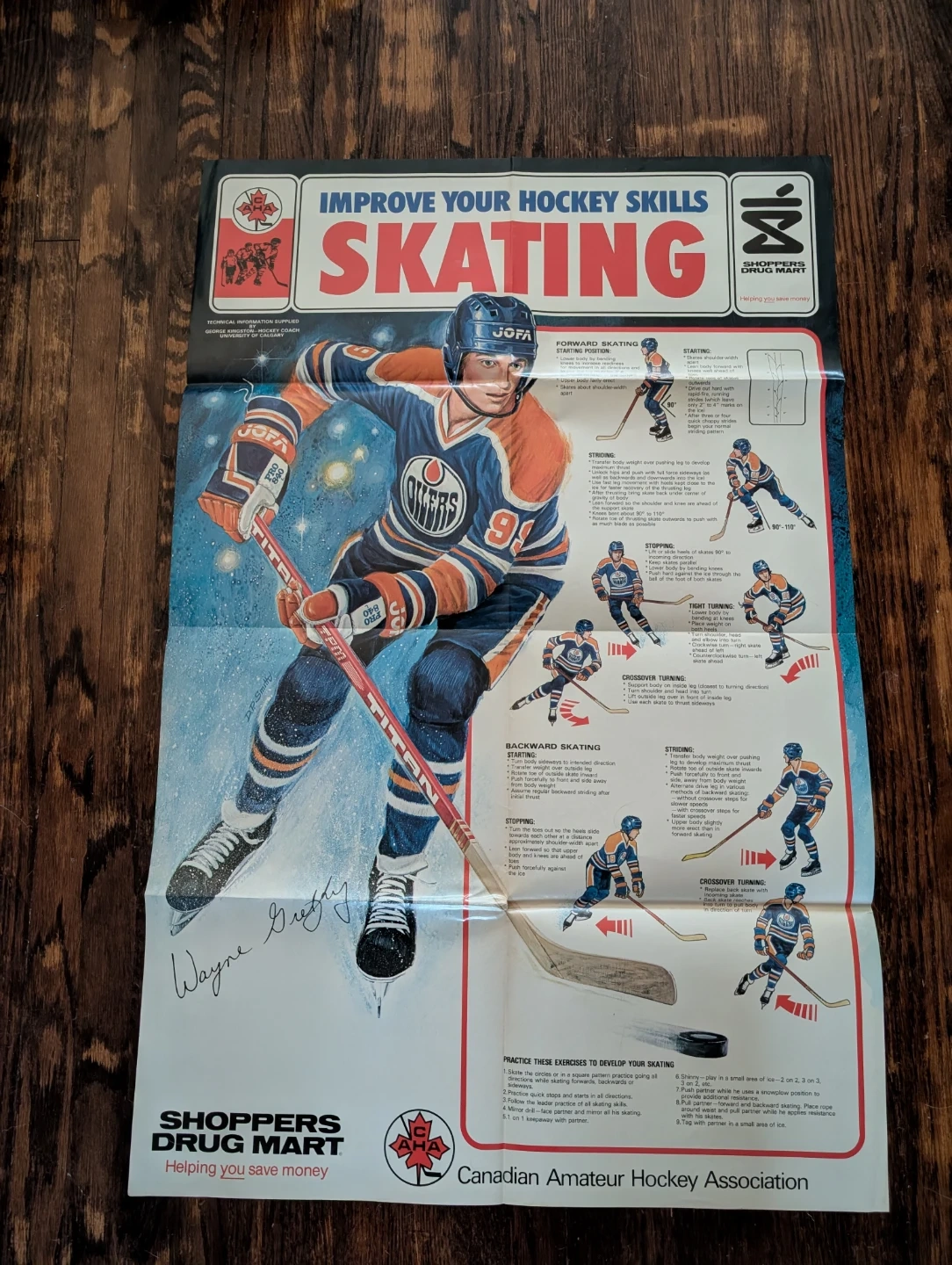 This vintage poster "Improve Your Hockey Skills Skating" features Wayne Gretzky. It details starting, stopping, crossover turns, and backward skating techniques. Printed by Shoppers Drug Mart 1981