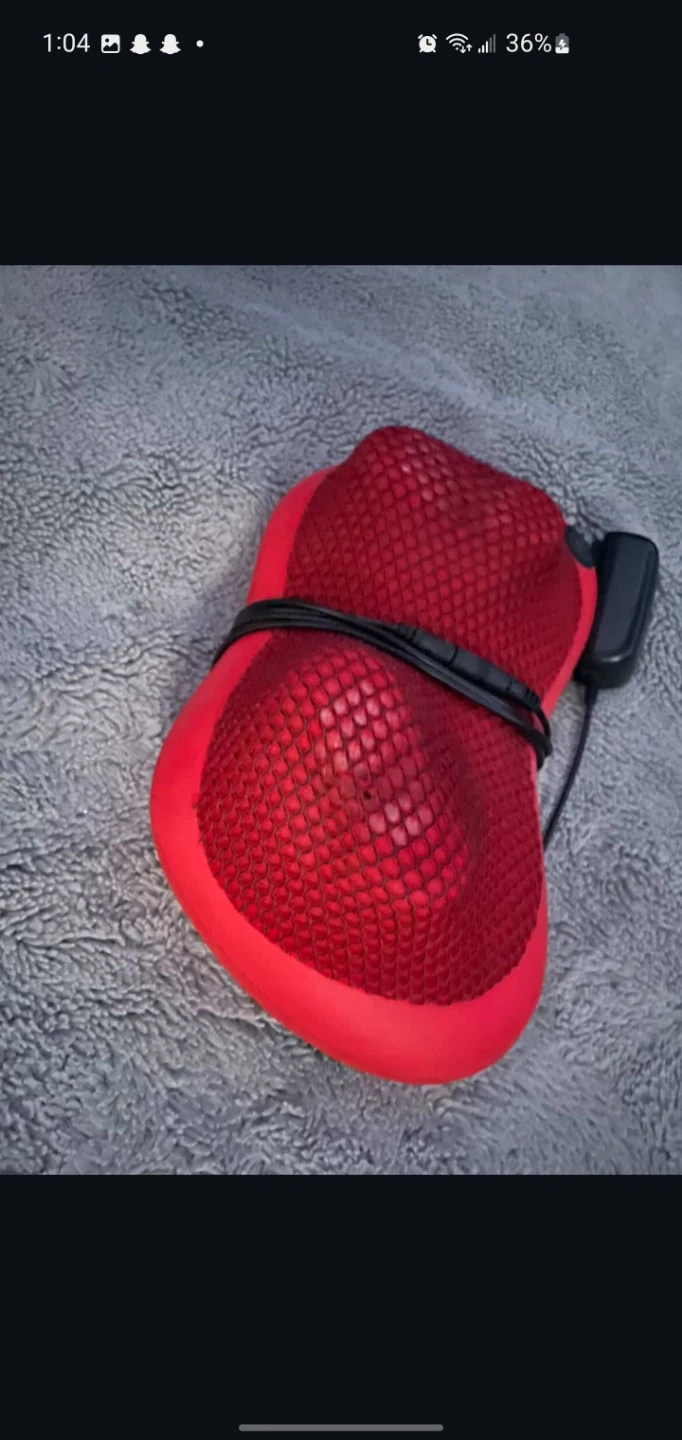 This red neck and back massager pillow features a mesh fabric. It has straps to secure it in place. Power adapter included. Great for soothing muscle tension after a long day!