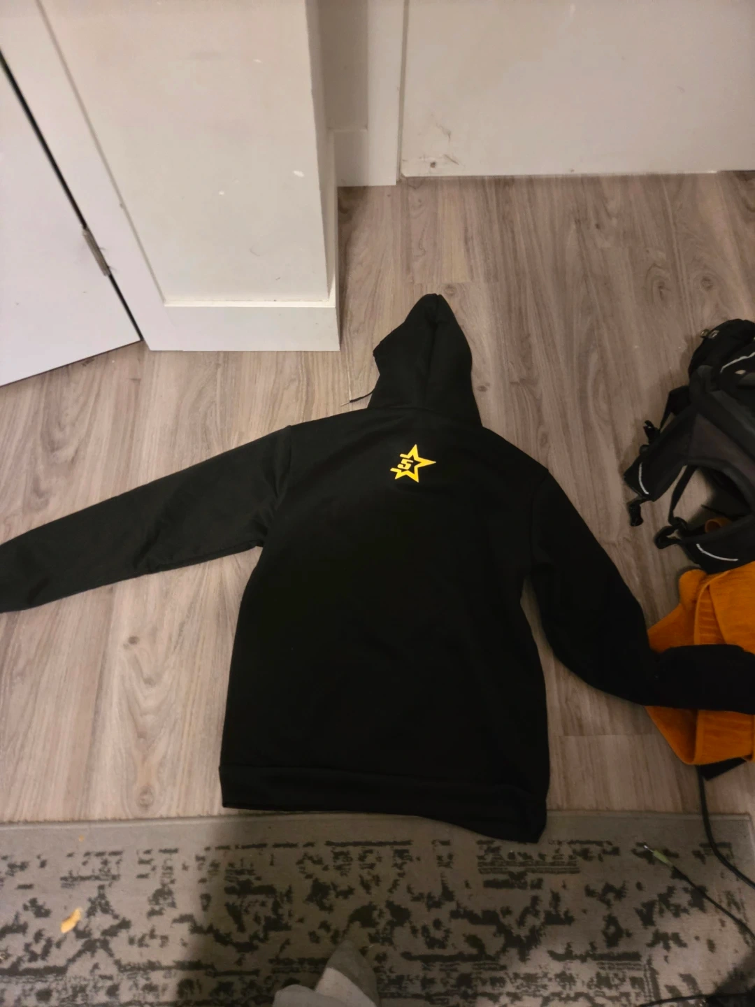 Black hoodie with a spider web graphic and text that reads 'nevermind the spiders'. It's size medium. The back has a yellow star graphic. Cash only pick up in st albert