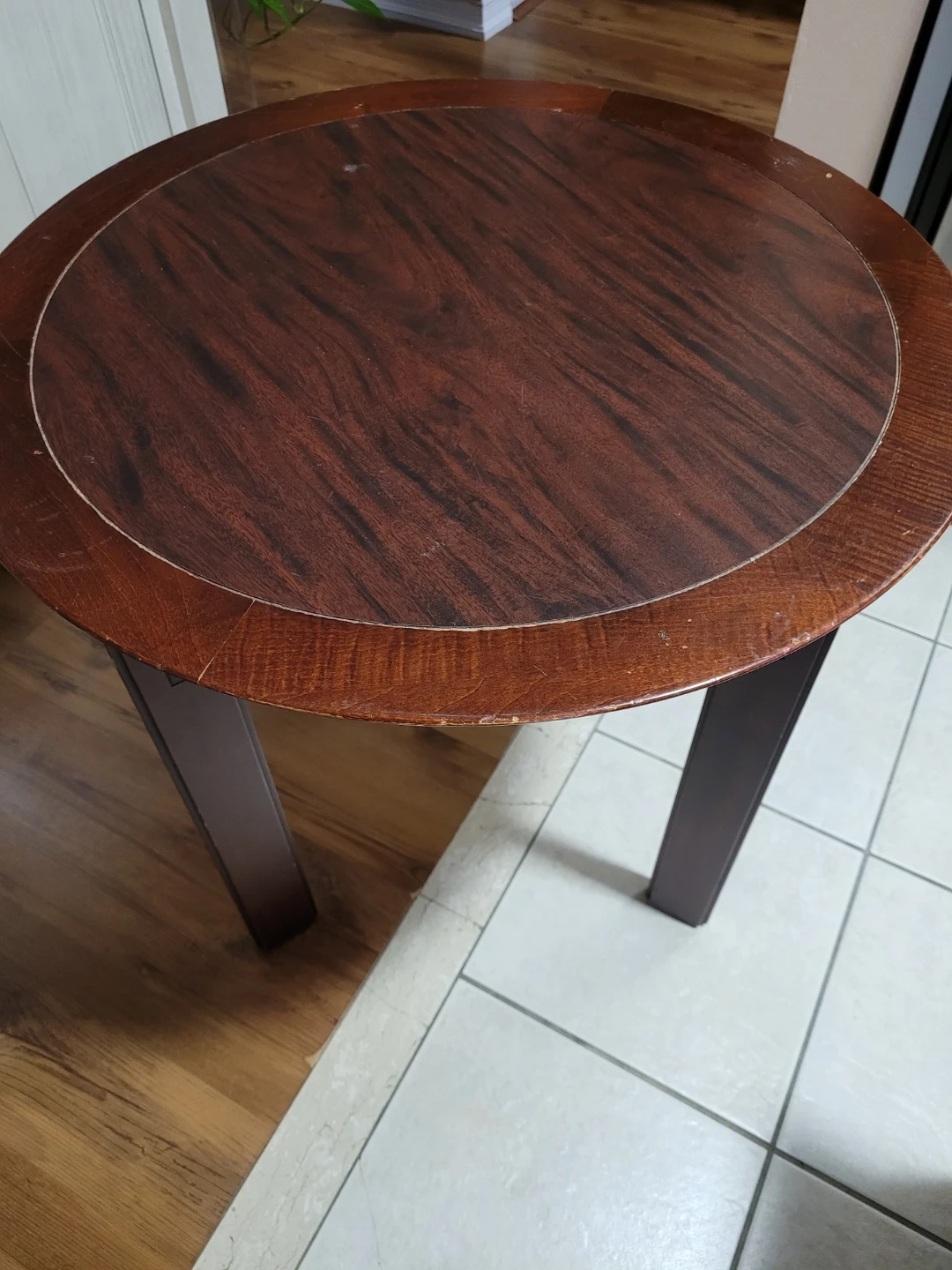 Selling a round table from Textured Fine Furniture Inc. It's a lovely piece made in Canada. The table has a rich, dark wood finish that would complement any room. It's a sturdy table, perfect for a small space or as an accent piece