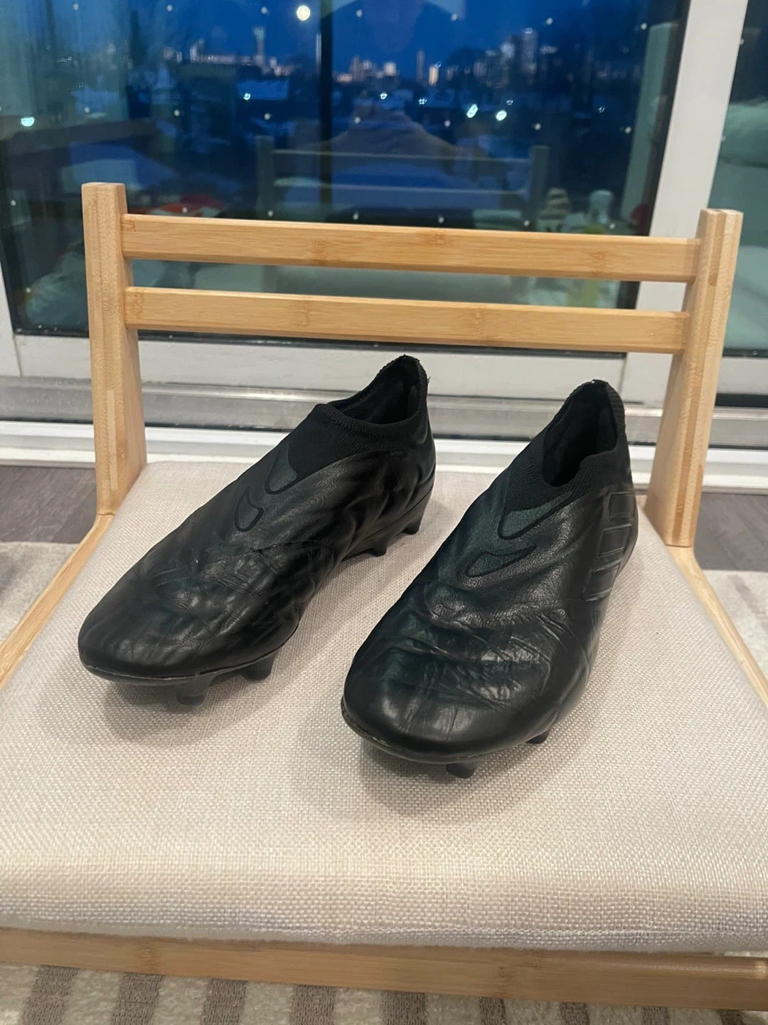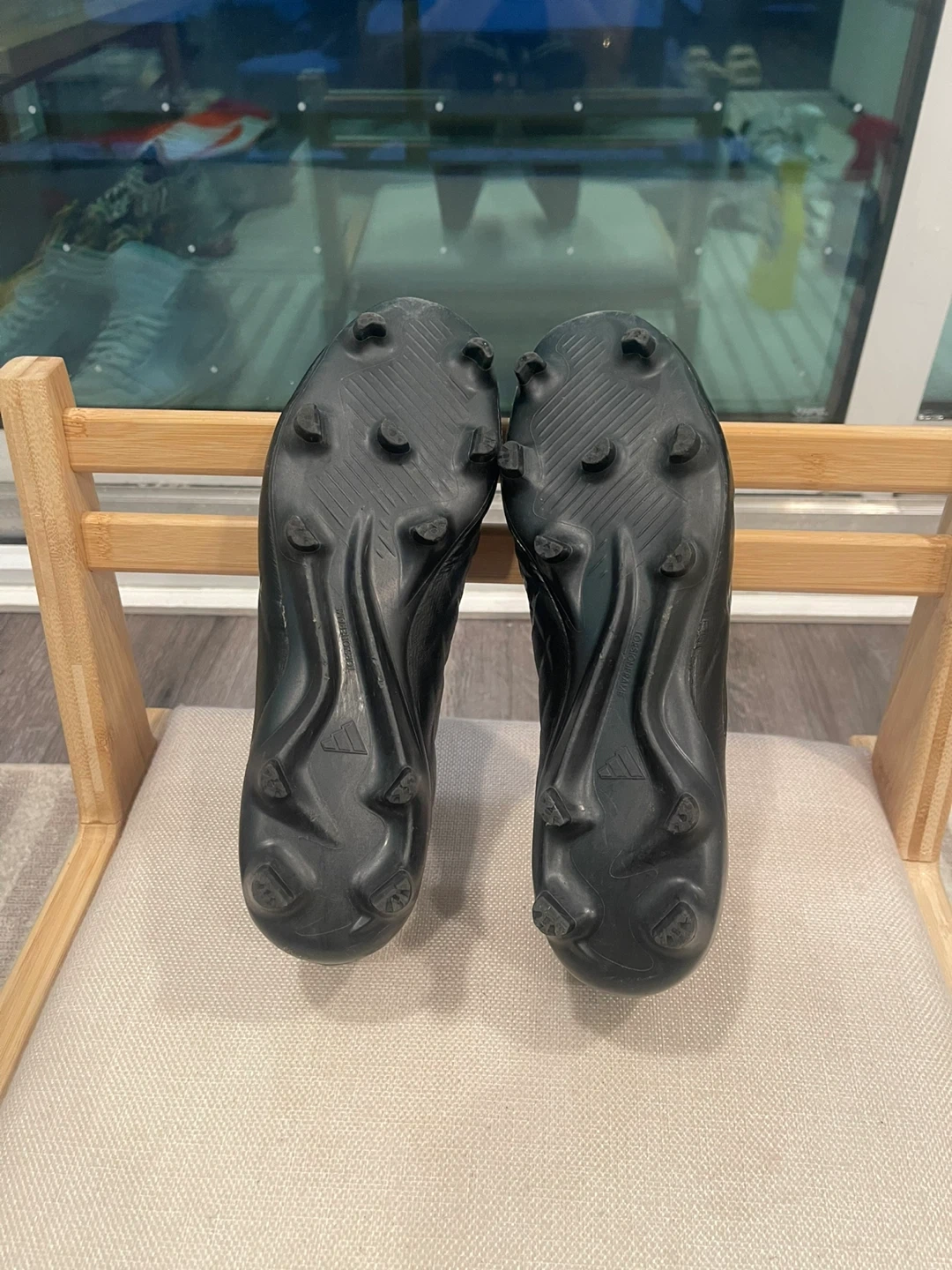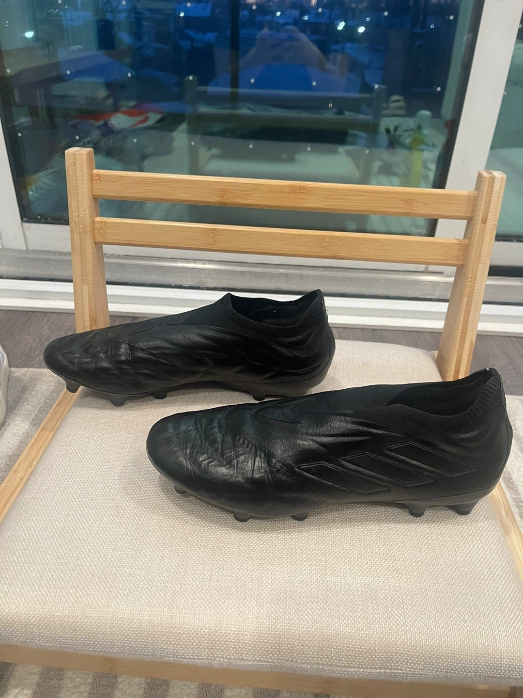 Black Adidas football cleats. Designed for soccer performance. It's a black, low-top cleat with a sock-like collar. These cleats have a durable outsole with firm ground studs.
