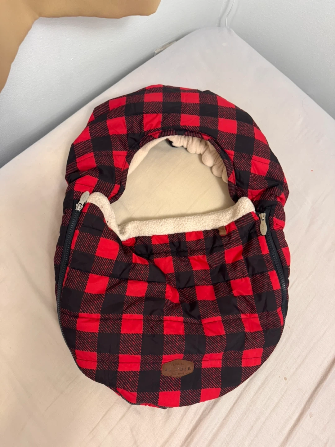 76Keep your little one cozy with this JJ Cole car seat cover! It features a red and black plaid pattern on the outside and a soft, plush interior to keep baby warm. It zips open and closed, making it easy to get baby in and out. Perfect for those chilly Canadian days! Fits in all universal baby car seats. Only used occasionally for 1 winter season.