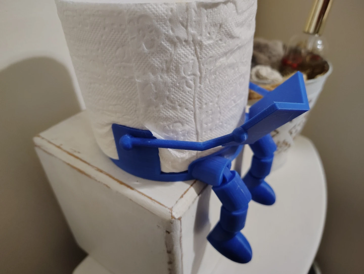 This quirky toilet paper holder features a blue, articulated figure sitting and reading. It's a fun and unique addition to any bathroom. The holder is designed to accommodate a standard-sized toilet paper roll.
