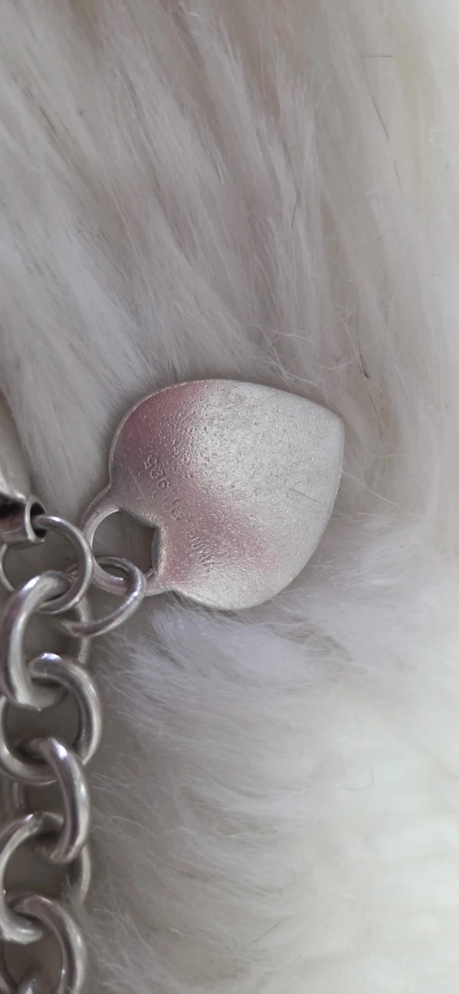 This is a Tiffany & Co. Inspired sterling silver heart tag bracelet. It measures approximately 7.5 inches long. The bracelet is made of sterling silver.