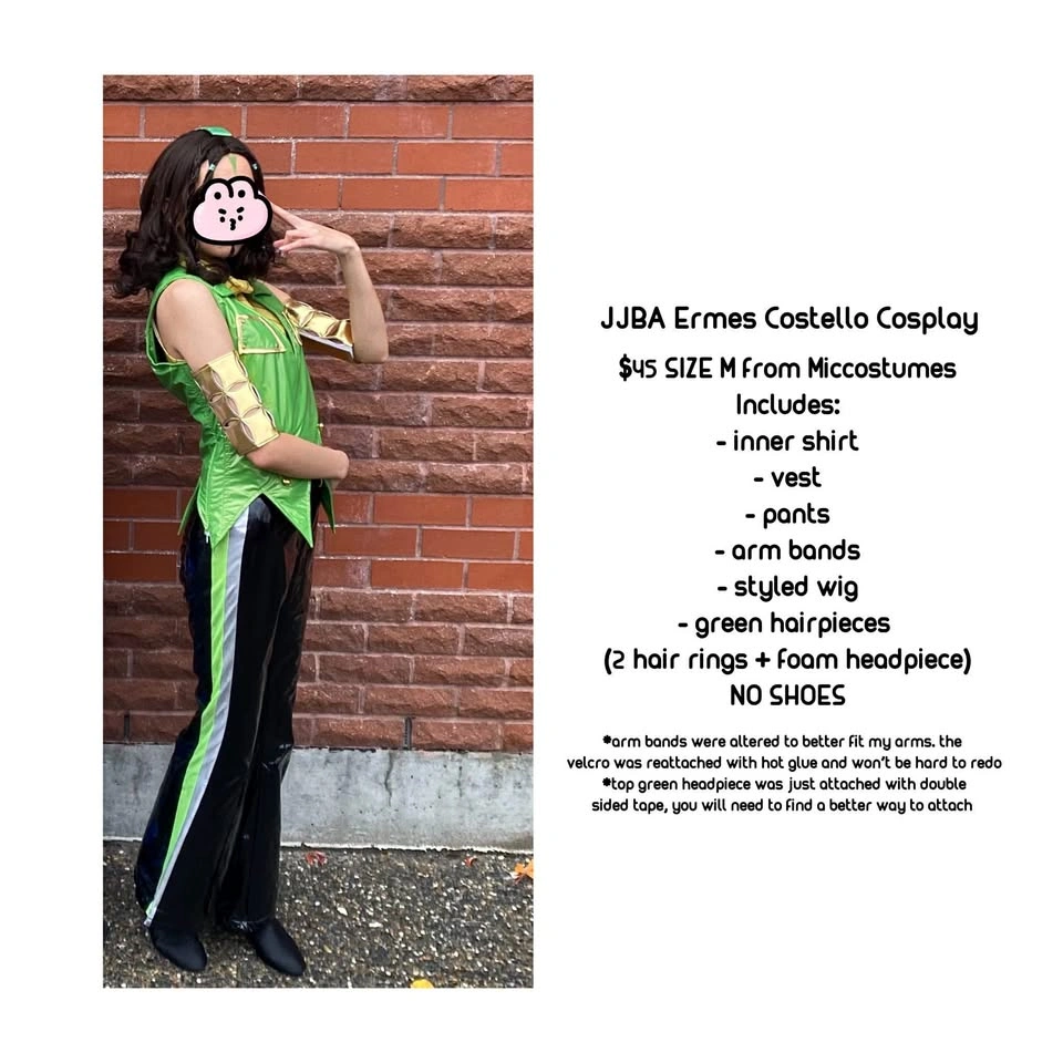10Hi, I’m selling my cosplays! Open to reasonable offers. JJBA/Jojo’s Bizarre Adventures Ermes Costello $45 (NOW REDUCED TO $30) Size M size chart in second pic Includes: turtleneck, vest, pants, armbands, styled wig and hair accessories. Shoes NOT INCLUDED - See details in photo about arm bands and headpieces. - While the wig is styled, it has been stored in a bag so you may need to restyle slightly. Worn once at a small con, just never really reached for the cos anymore after.