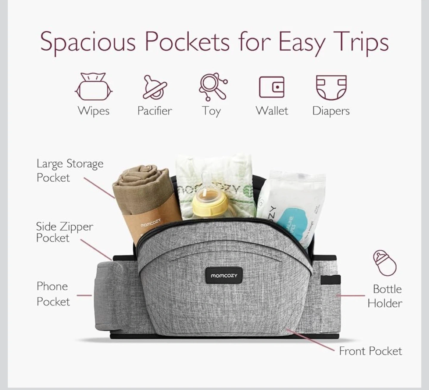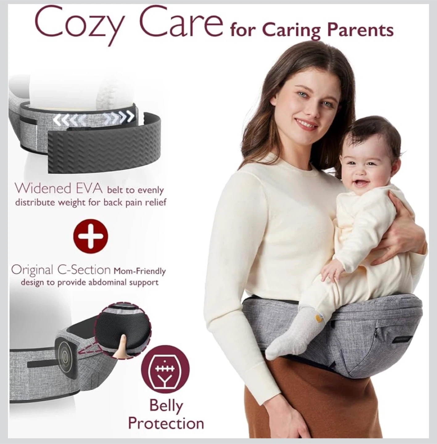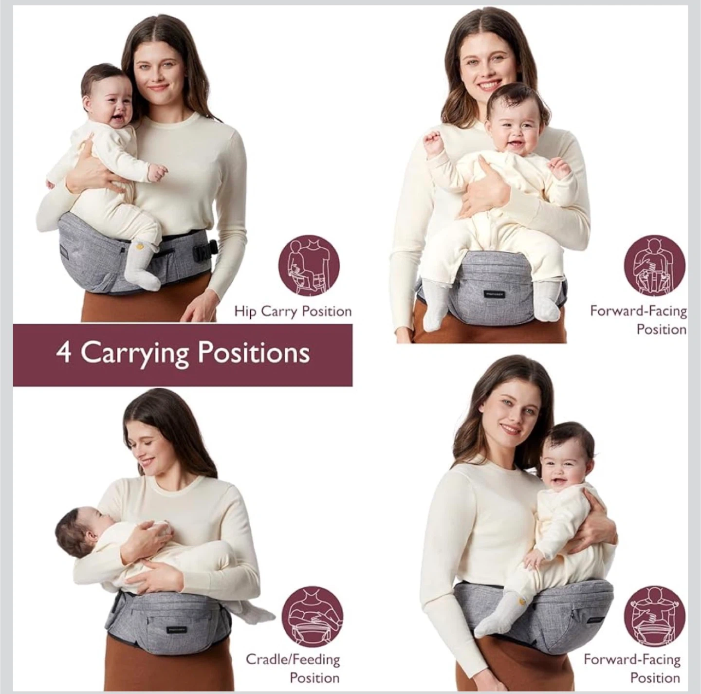 Grey hip seat baby carrier with multiple pockets for easy trips. It features a widened EVA belt for weight distribution and belly protection. Offers 4 carrying positions for comfort.