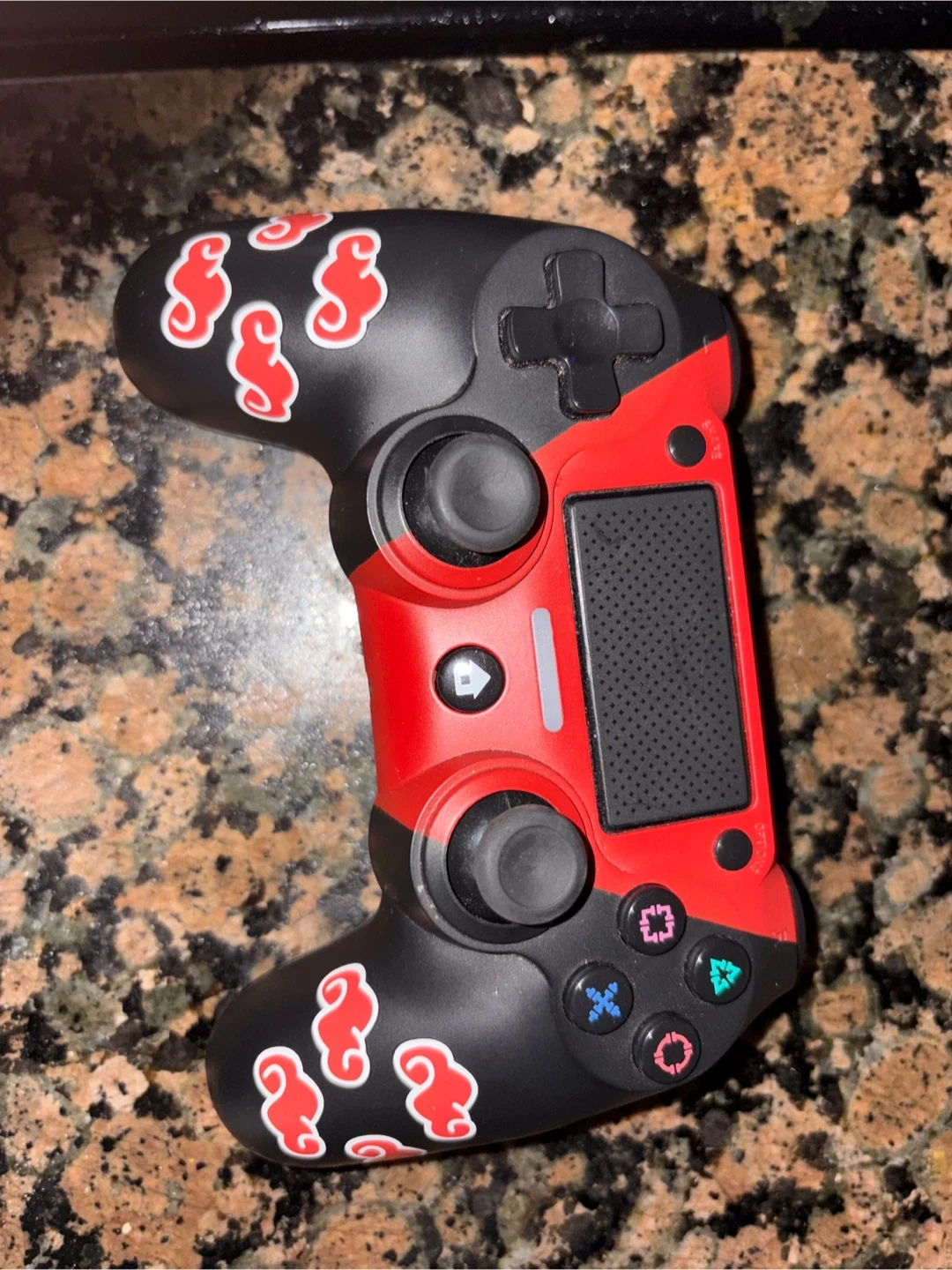 This is a custom controller with a black and red design featuring Naruto cloud symbols. It's a great addition for any Naruto fan's gaming setup. The controller's unique look makes it stand out from standard gamepads.