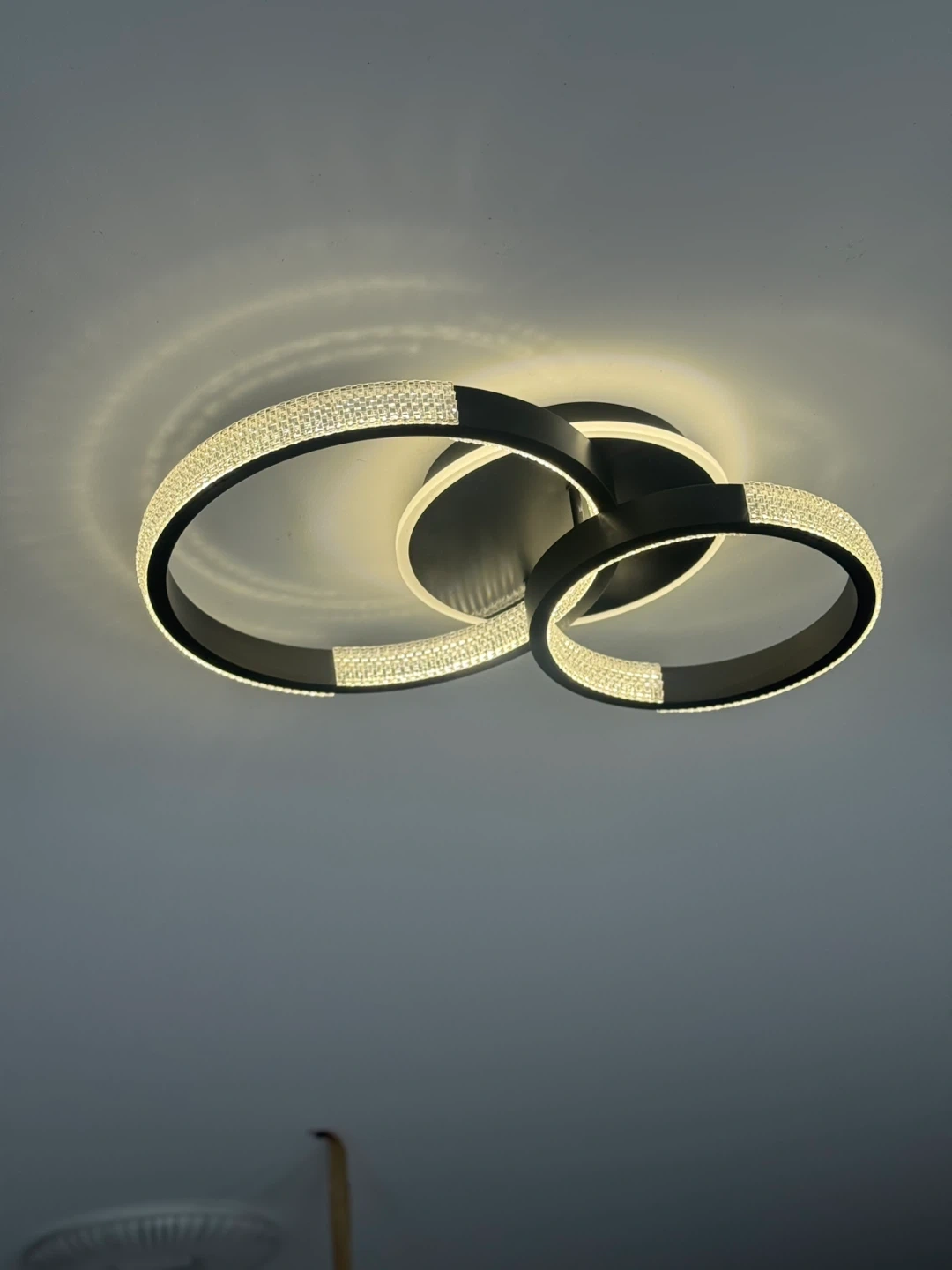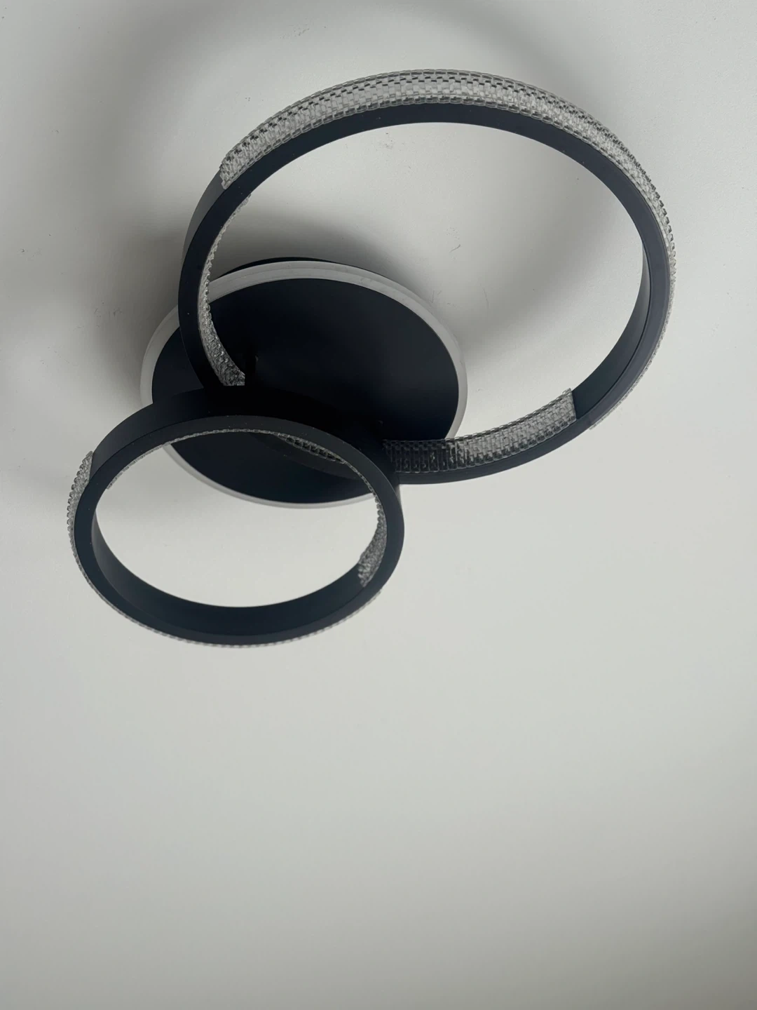 This contemporary flush mount ceiling light features a unique interlocking ring design with sparkling crystal accents. It's a stylish addition to any room, providing a warm glow. The fixture is made of durable metal with a black finish. It's suitable for living rooms, bedrooms, or hallways.