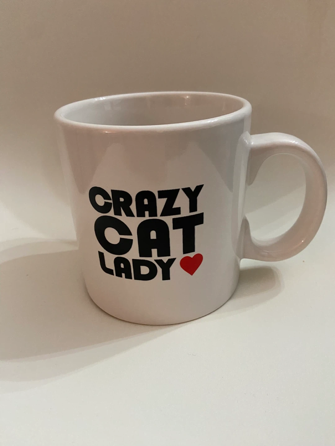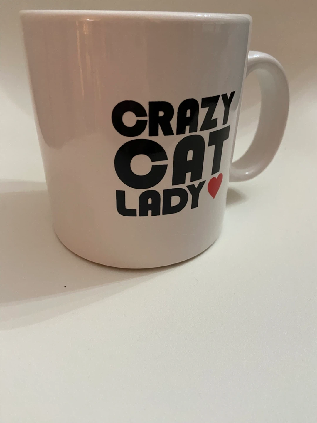 White ceramic mug with "CRAZY CAT LADY" text and a red heart. It's a standard mug size, perfect for your morning coffee or tea! This mug is a fun way to show off your love for cats.