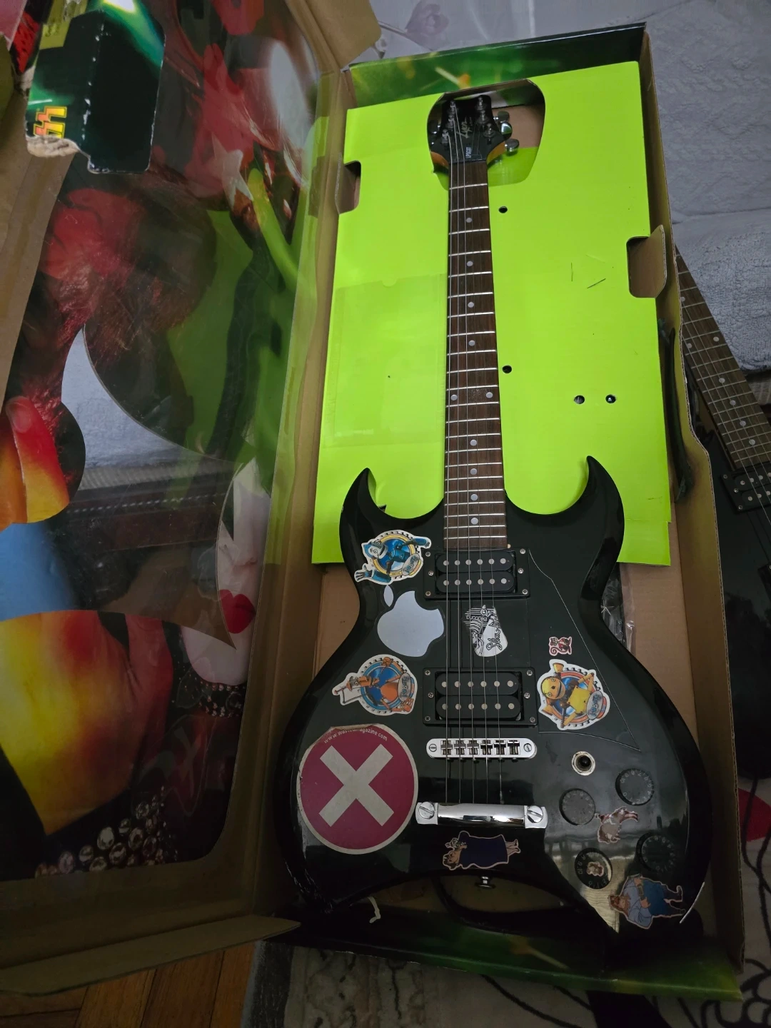 Other issue...needs cleaning, new strings and lots of fun stkckers but w you may want to remove. .