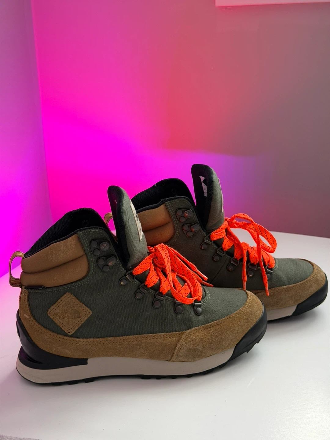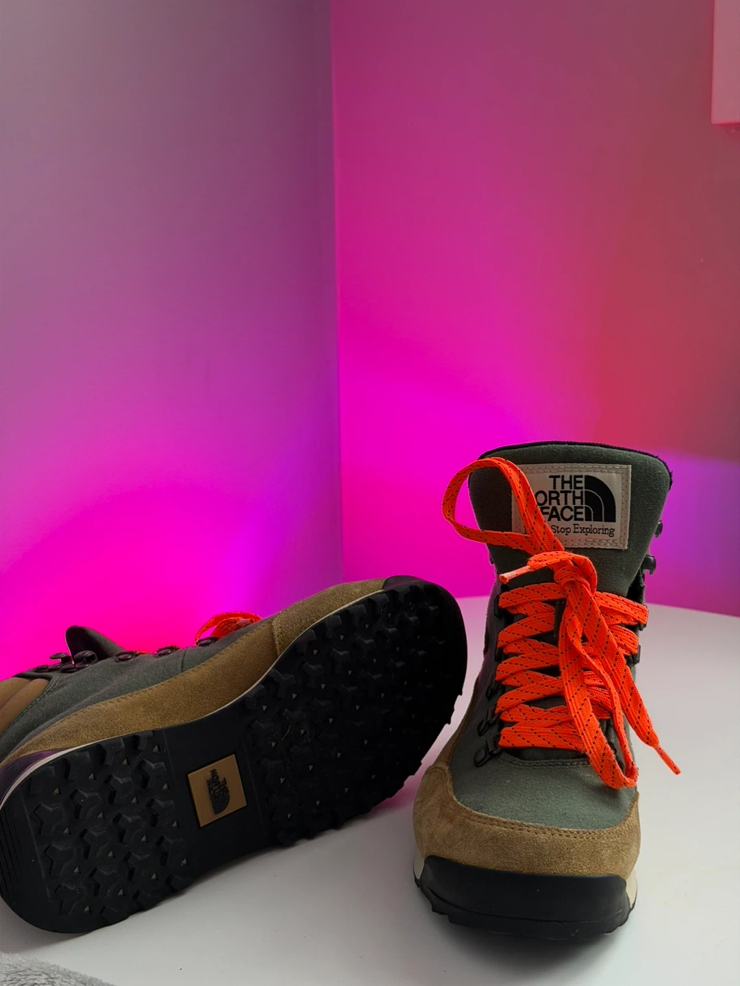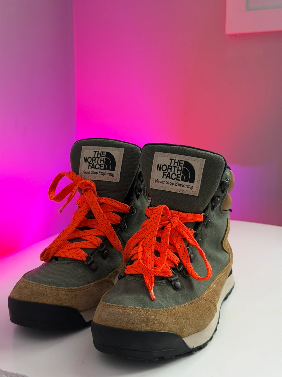 These North Face hiking boots are designed for comfort and durability. They feature a green canvas and brown suede upper with bright orange laces. Perfect for your next outdoor adventure!