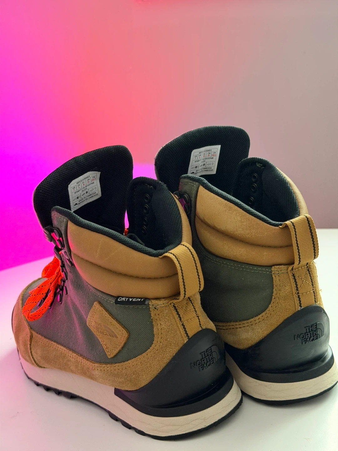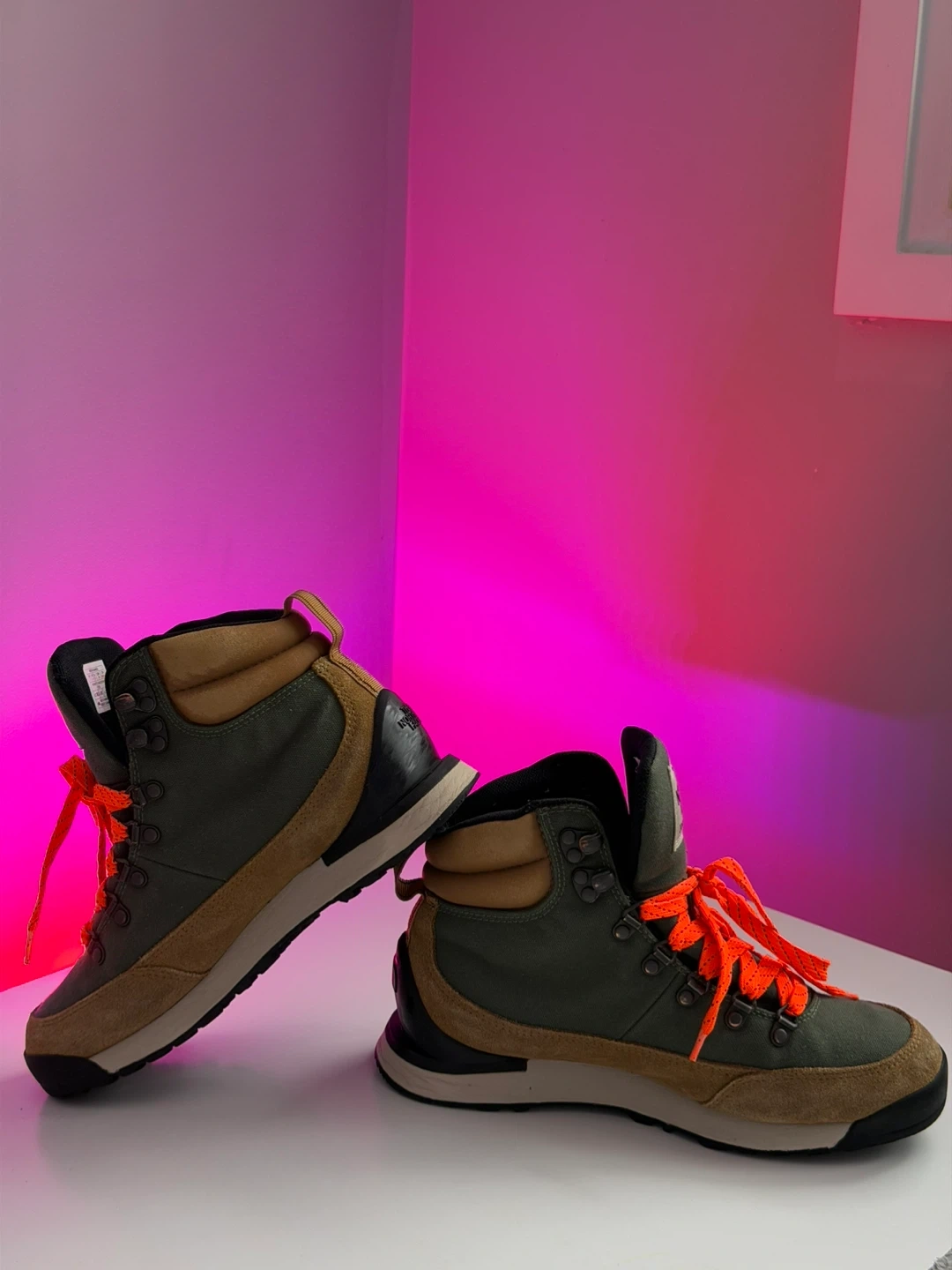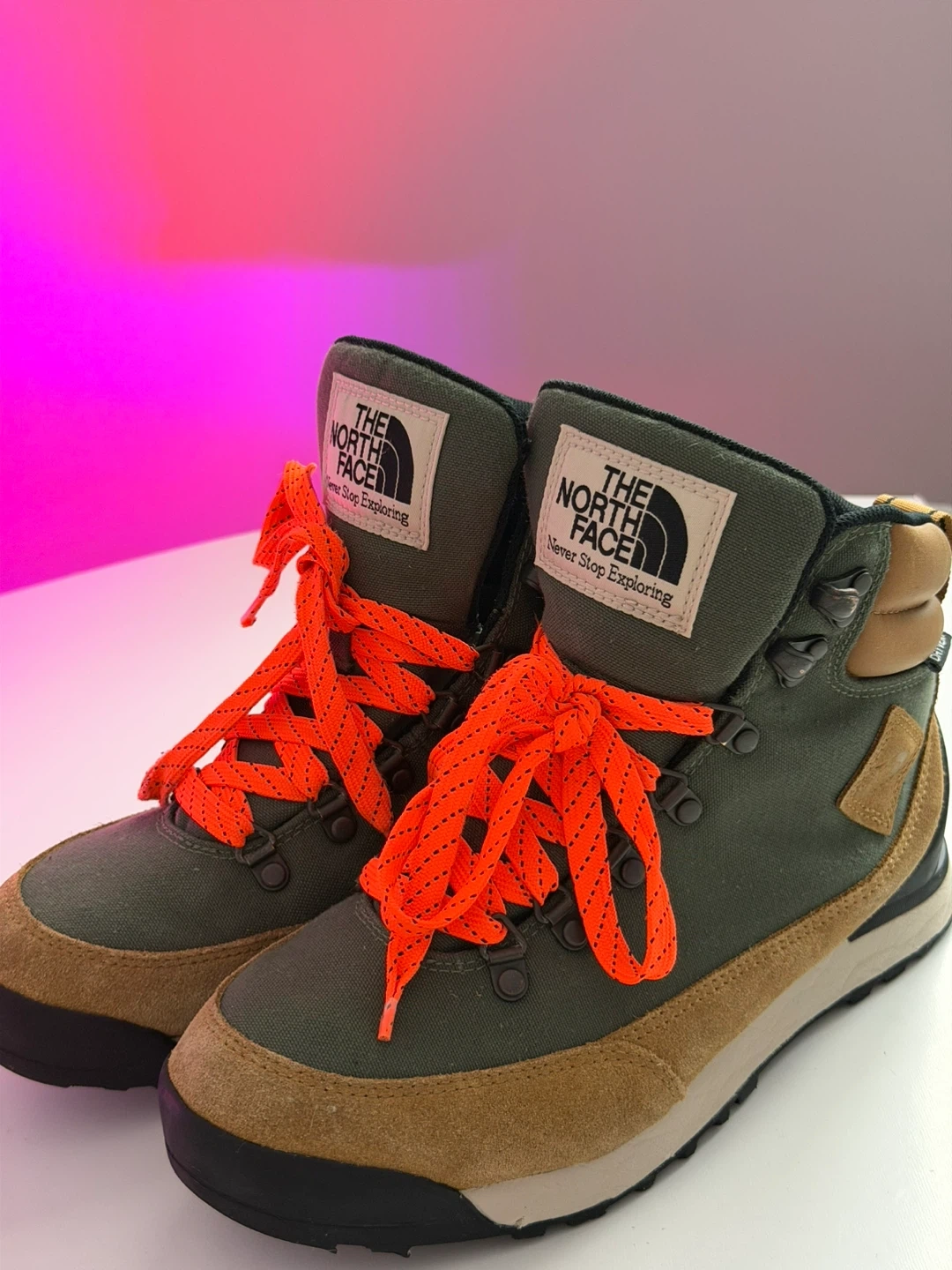 These North Face hiking boots are designed for comfort and durability. They feature a green canvas and brown suede upper with bright orange laces. Perfect for your next outdoor adventure!