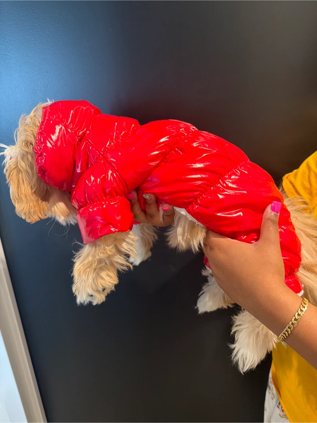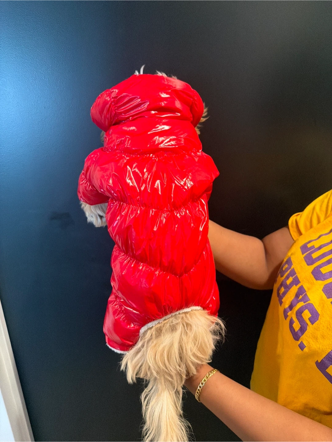 Super cute and warm red shiny puffer coat for your dog. It's lined with soft white fluffy for extra comfort. Features snap buttons down the front for easy on and off. Keeps your furry friend cozy during cold weather!