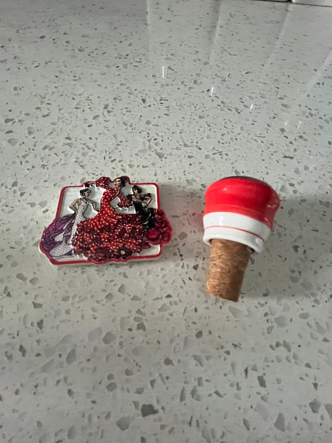 This decorative bottle stopper features three flamenco dancers. It has a cork base and a red and white ceramic top with a detailed illustration and a magnetic . Perfect for keeping your opened wine or spirits fresh!